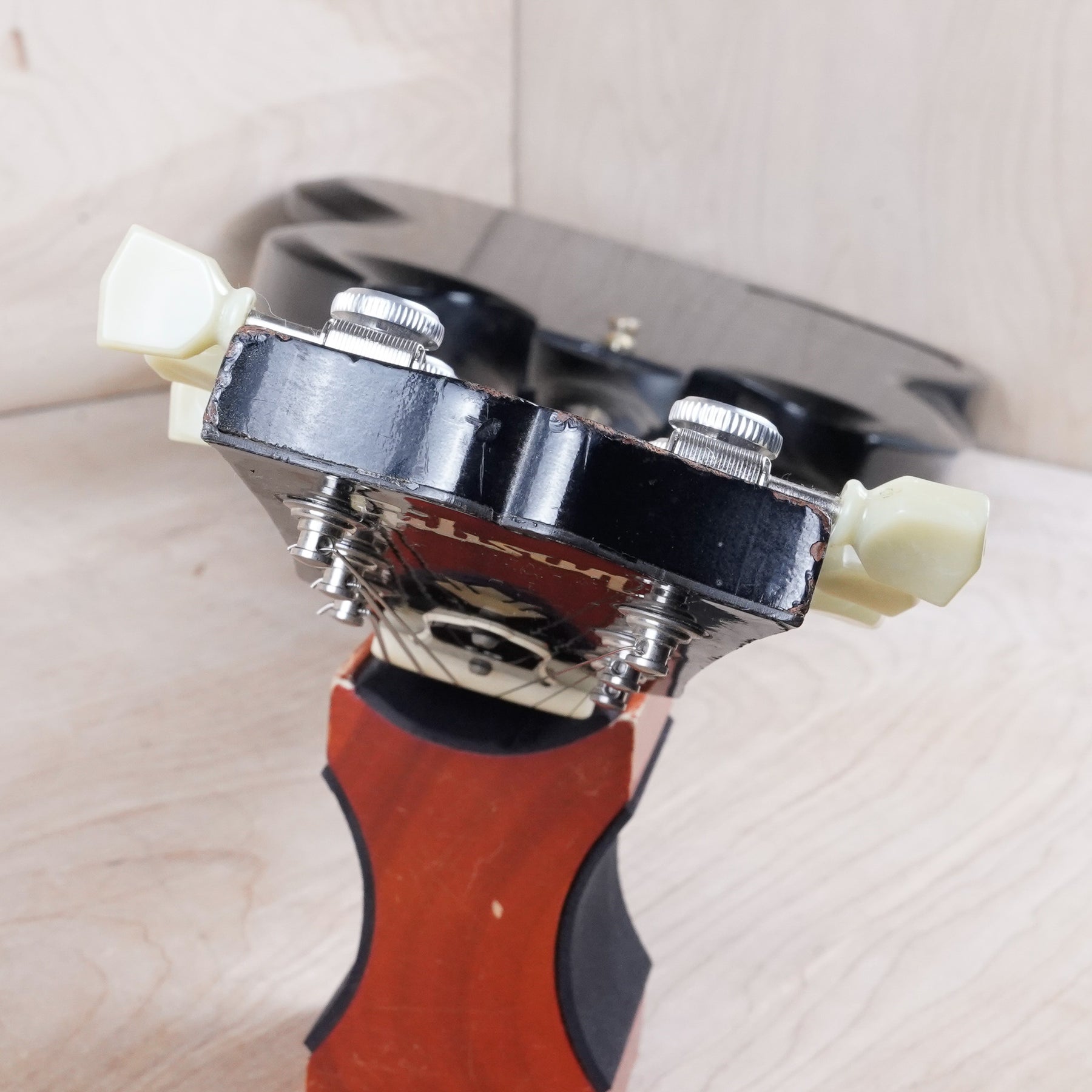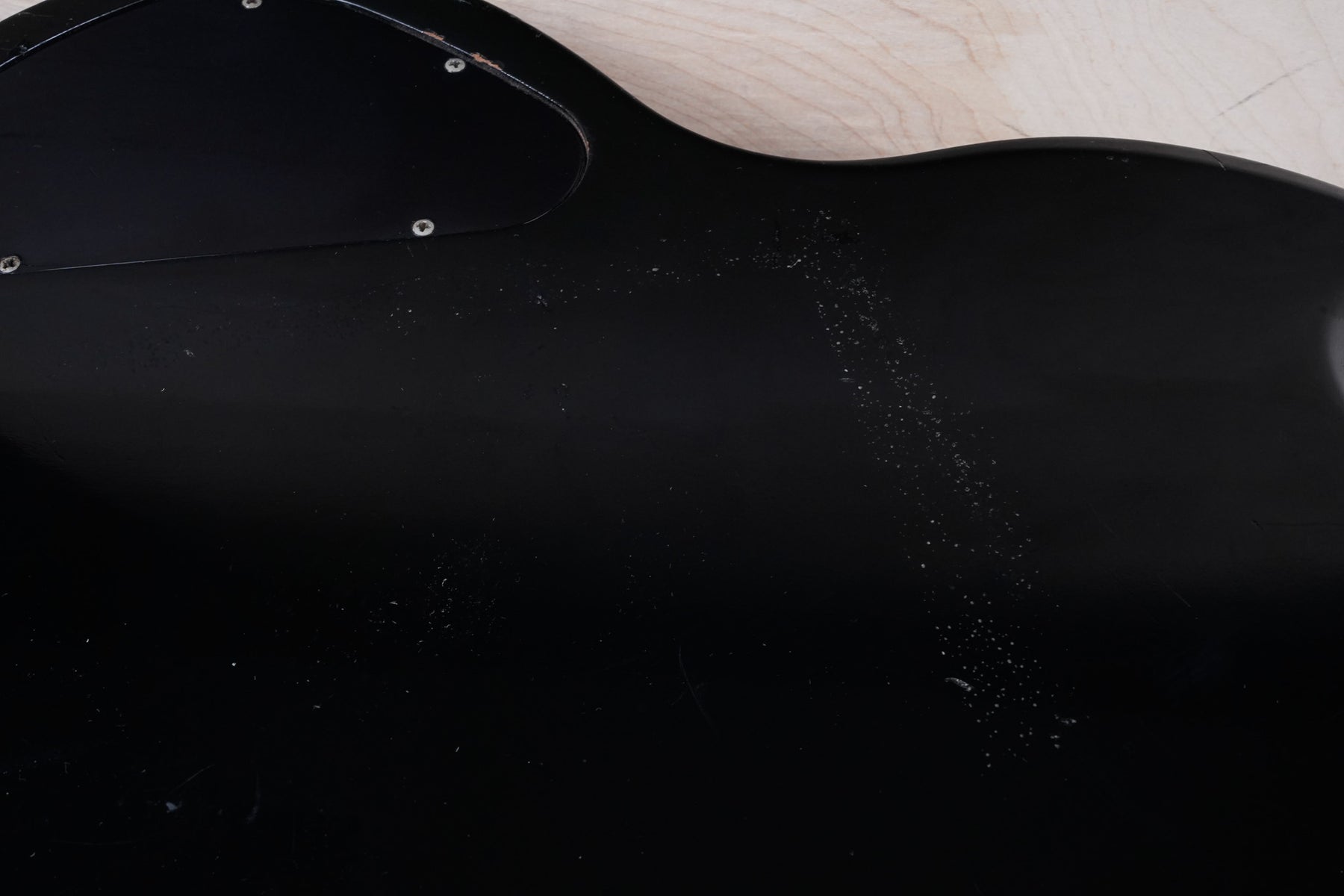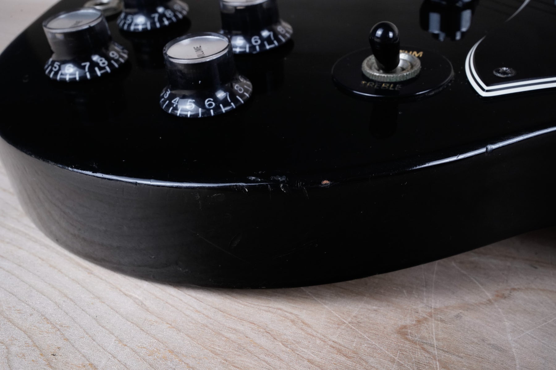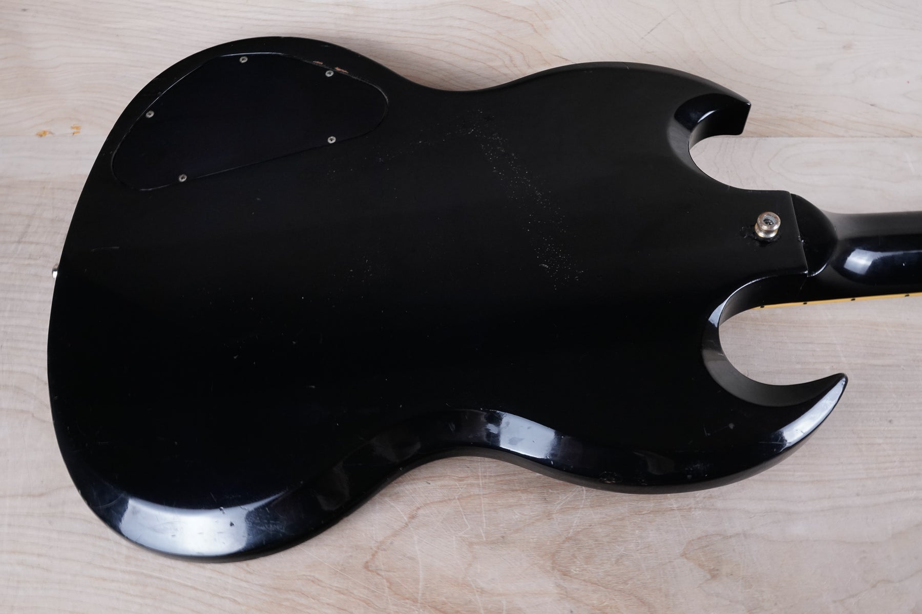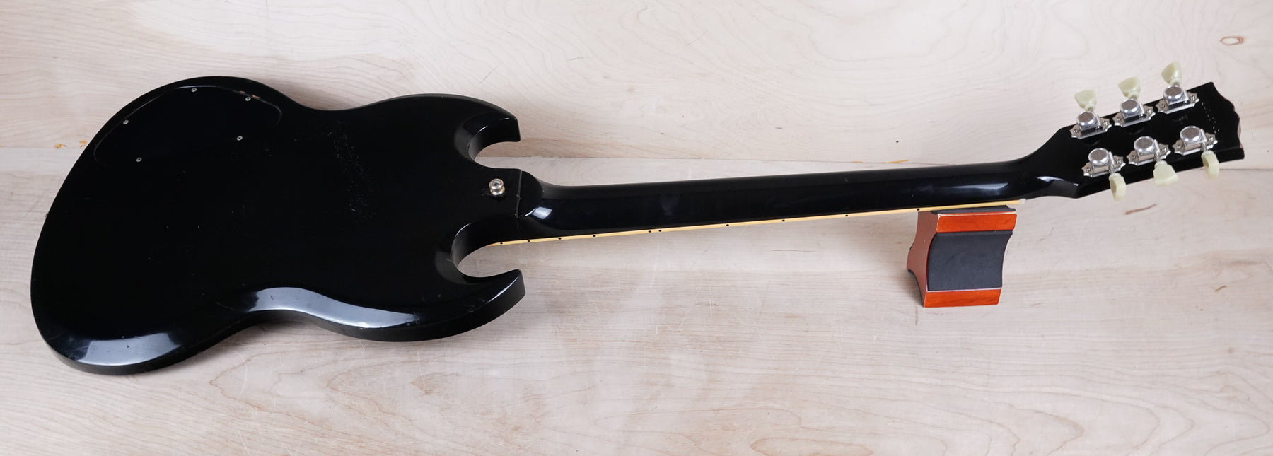 This guitar does show quite a bit of cosmetic wear from over the years that includes various surface scratches, scuffs, and dents throughout the body with additional dings along the back of the neck and headstock. There also appears to be imprints on the back of the body from where stickers had been placed at one point in time. There's also some splotchiness in the finish in that same area. The area underneath the strap button behind the neck heel is chipped and appears to have been filled. The binding has yellowed from over time and the hardware and pickups show normal tarnishing. The frets are used but still play great and the electronics work as they should.