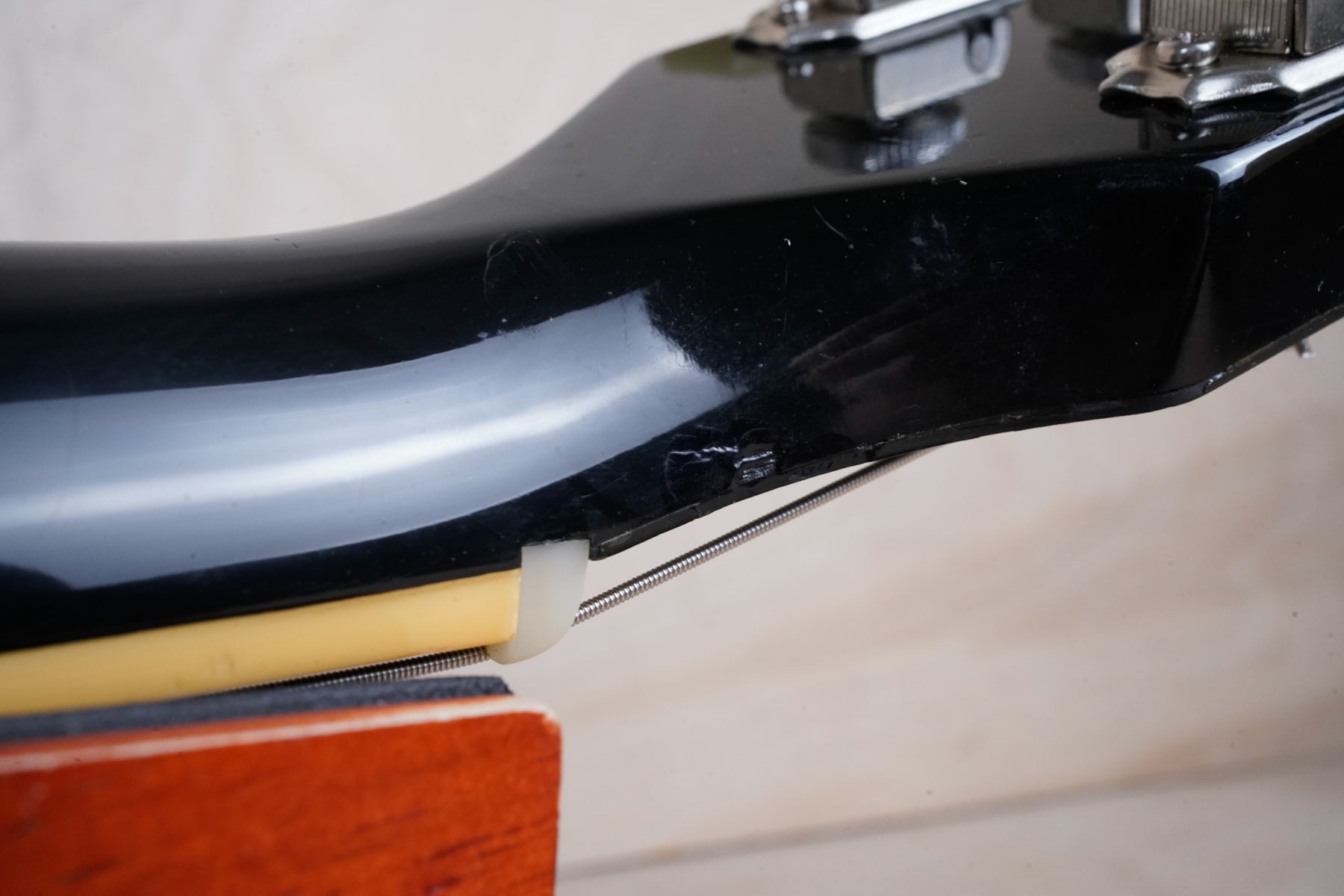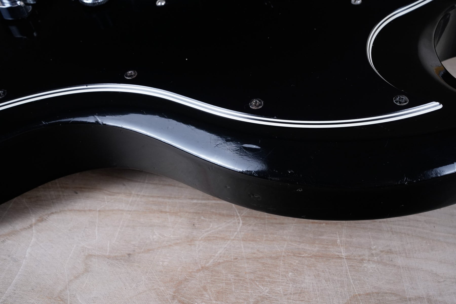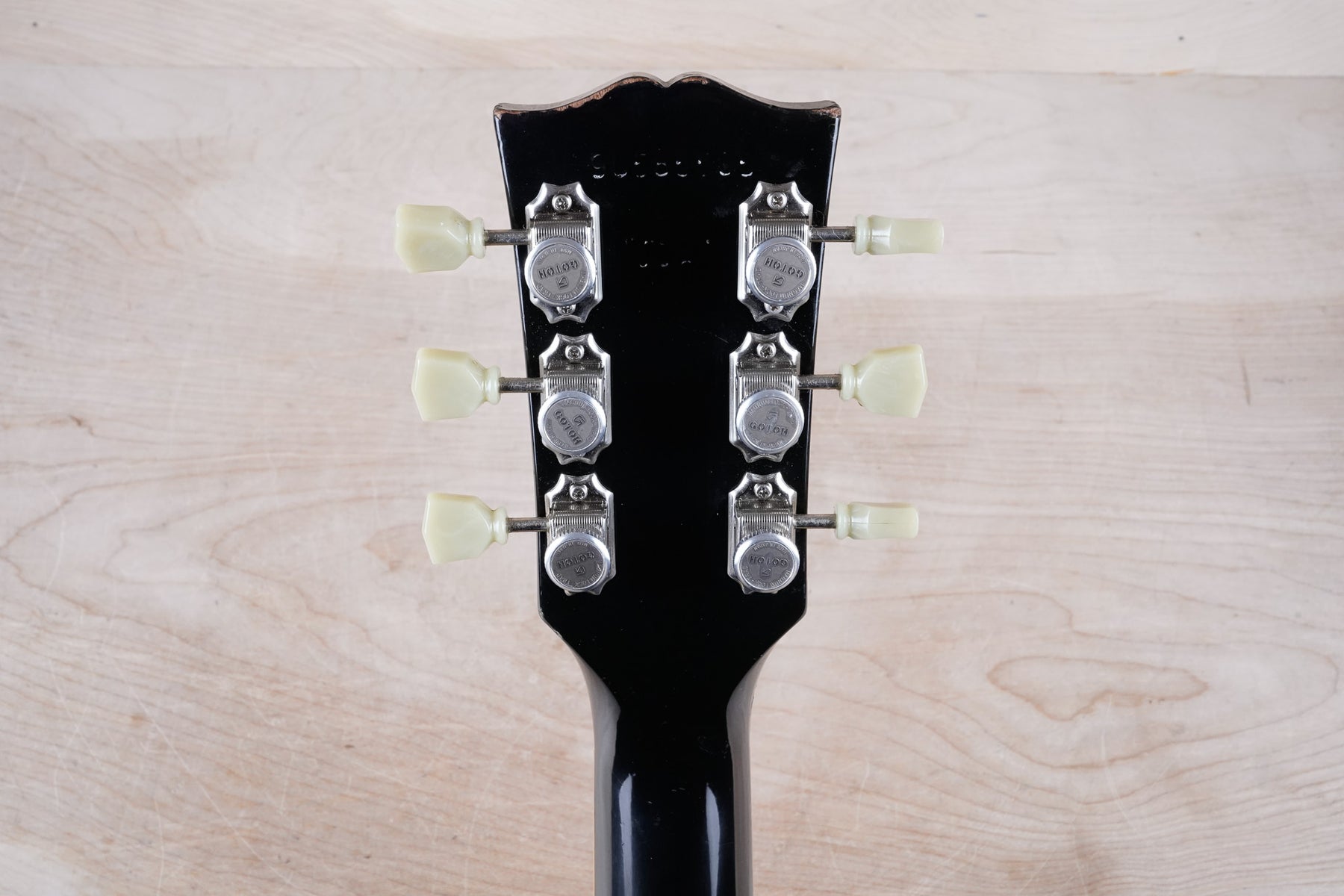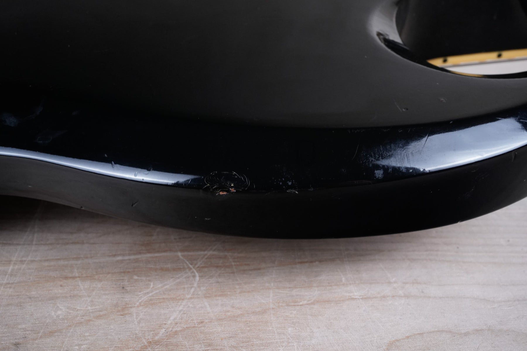 This guitar does show quite a bit of cosmetic wear from over the years that includes various surface scratches, scuffs, and dents throughout the body with additional dings along the back of the neck and headstock. There also appears to be imprints on the back of the body from where stickers had been placed at one point in time. There's also some splotchiness in the finish in that same area. The area underneath the strap button behind the neck heel is chipped and appears to have been filled. The binding has yellowed from over time and the hardware and pickups show normal tarnishing. The frets are used but still play great and the electronics work as they should.