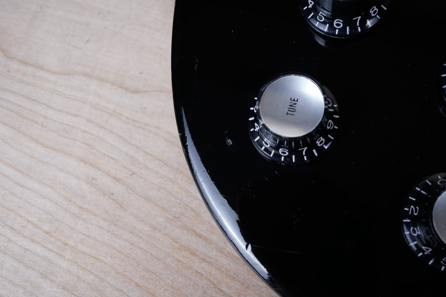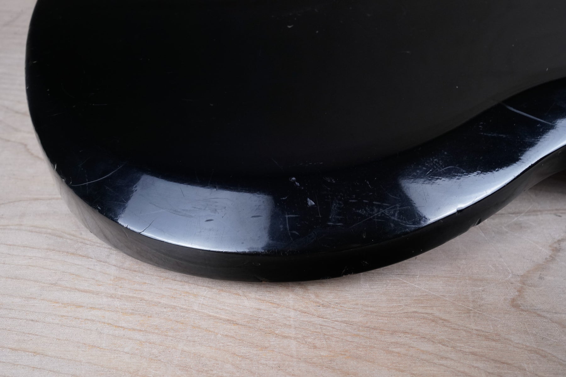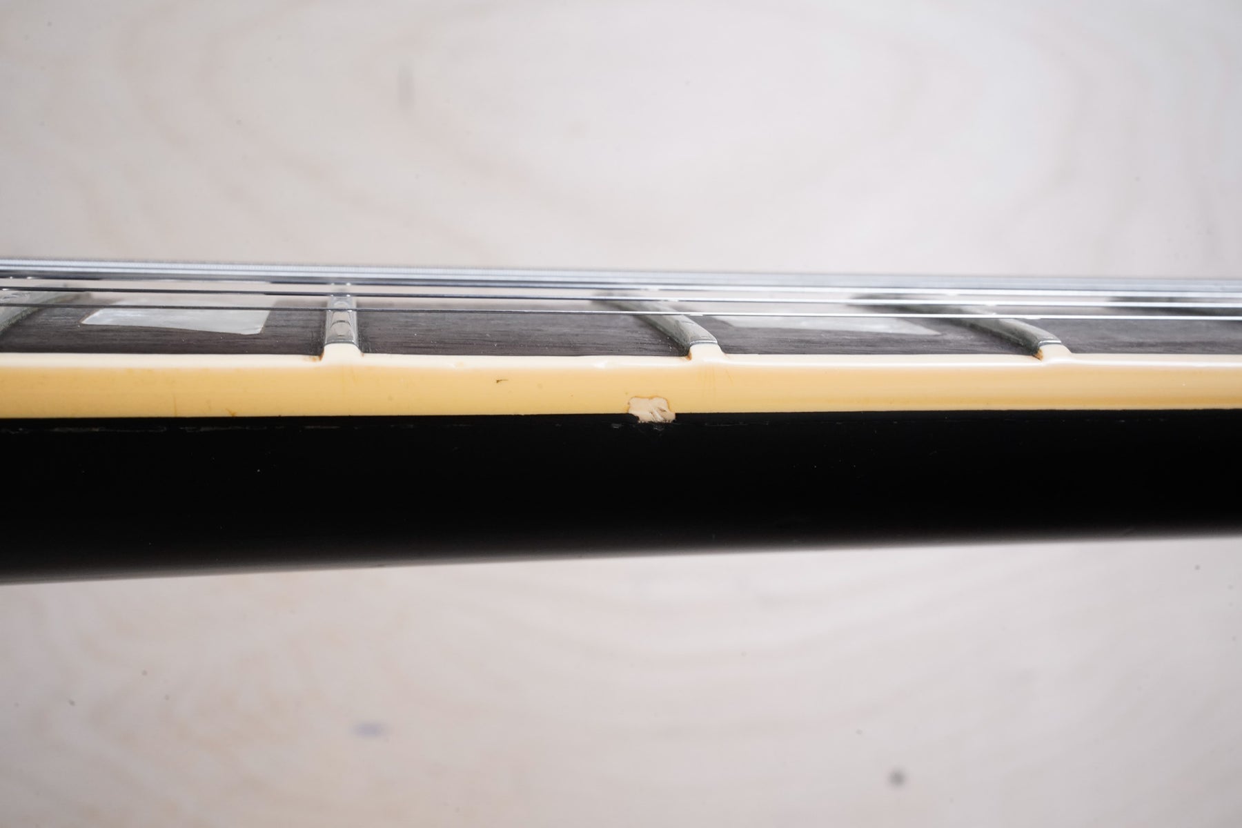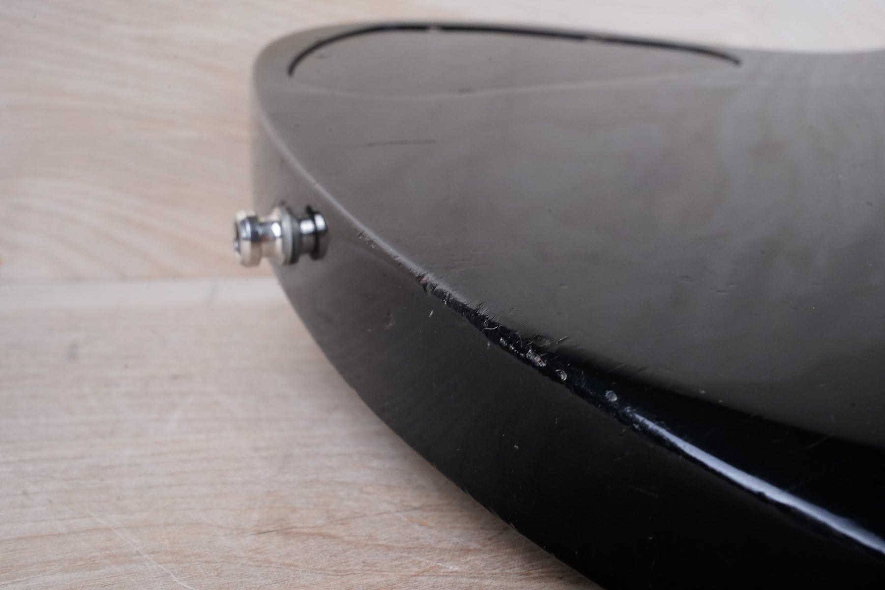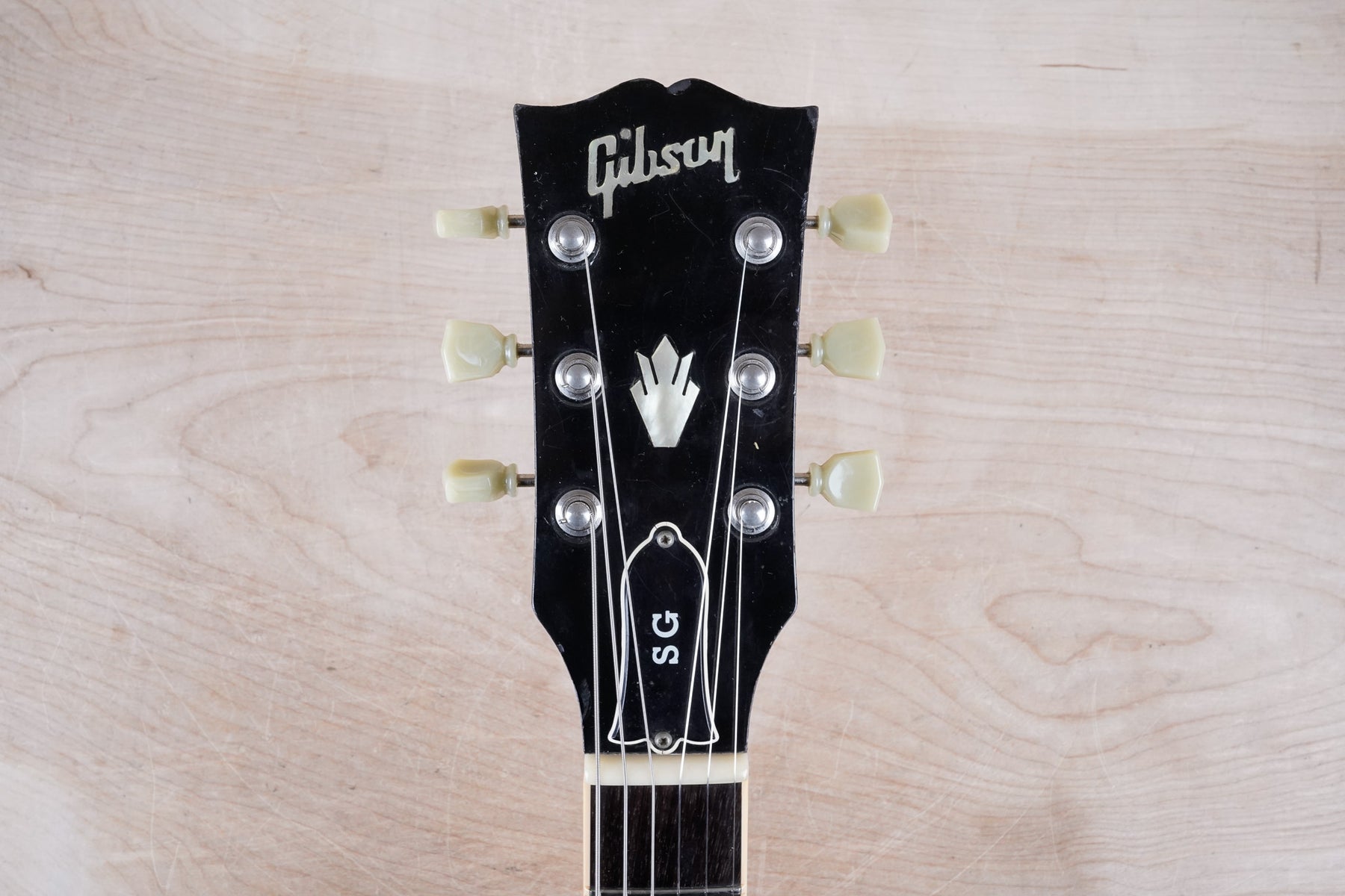 This guitar does show quite a bit of cosmetic wear from over the years that includes various surface scratches, scuffs, and dents throughout the body with additional dings along the back of the neck and headstock. There also appears to be imprints on the back of the body from where stickers had been placed at one point in time. There's also some splotchiness in the finish in that same area. The area underneath the strap button behind the neck heel is chipped and appears to have been filled. The binding has yellowed from over time and the hardware and pickups show normal tarnishing. The frets are used but still play great and the electronics work as they should.