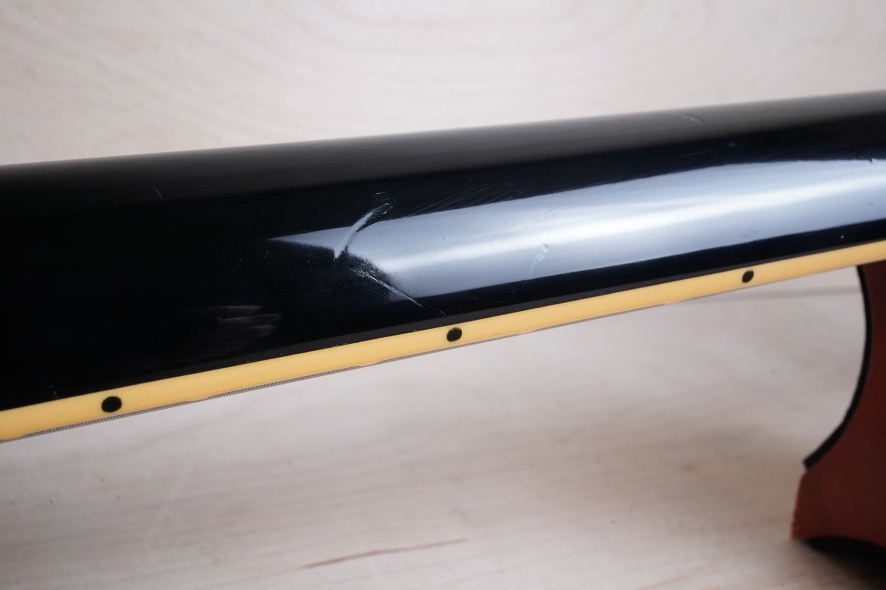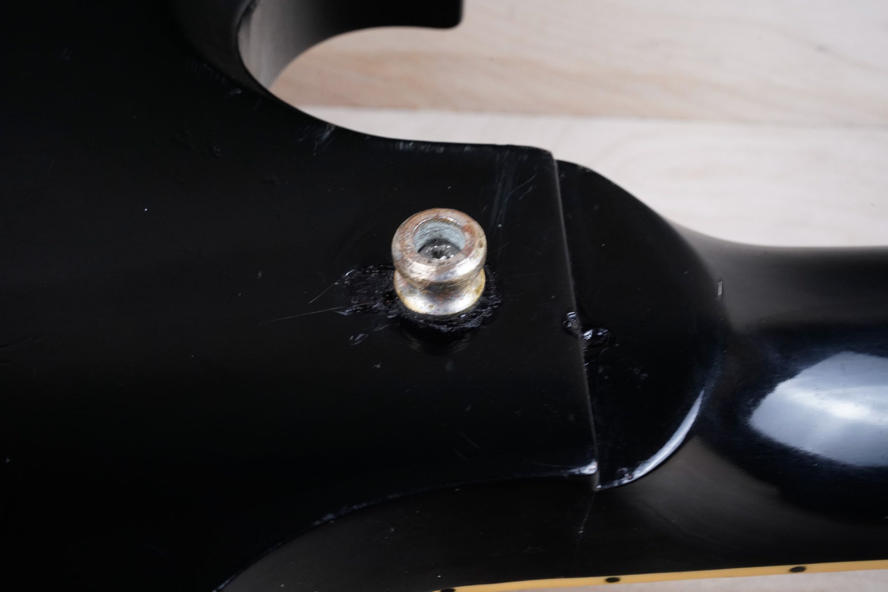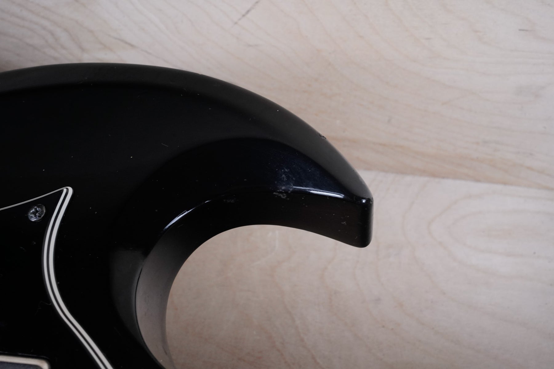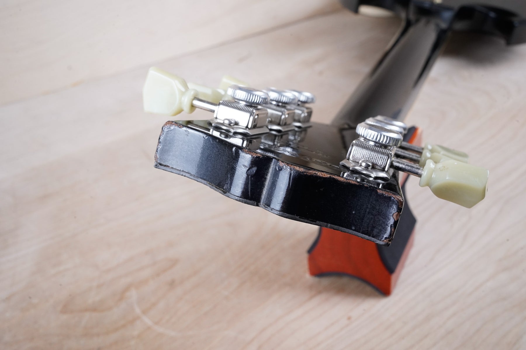 This guitar does show quite a bit of cosmetic wear from over the years that includes various surface scratches, scuffs, and dents throughout the body with additional dings along the back of the neck and headstock. There also appears to be imprints on the back of the body from where stickers had been placed at one point in time. There's also some splotchiness in the finish in that same area. The area underneath the strap button behind the neck heel is chipped and appears to have been filled. The binding has yellowed from over time and the hardware and pickups show normal tarnishing. The frets are used but still play great and the electronics work as they should.