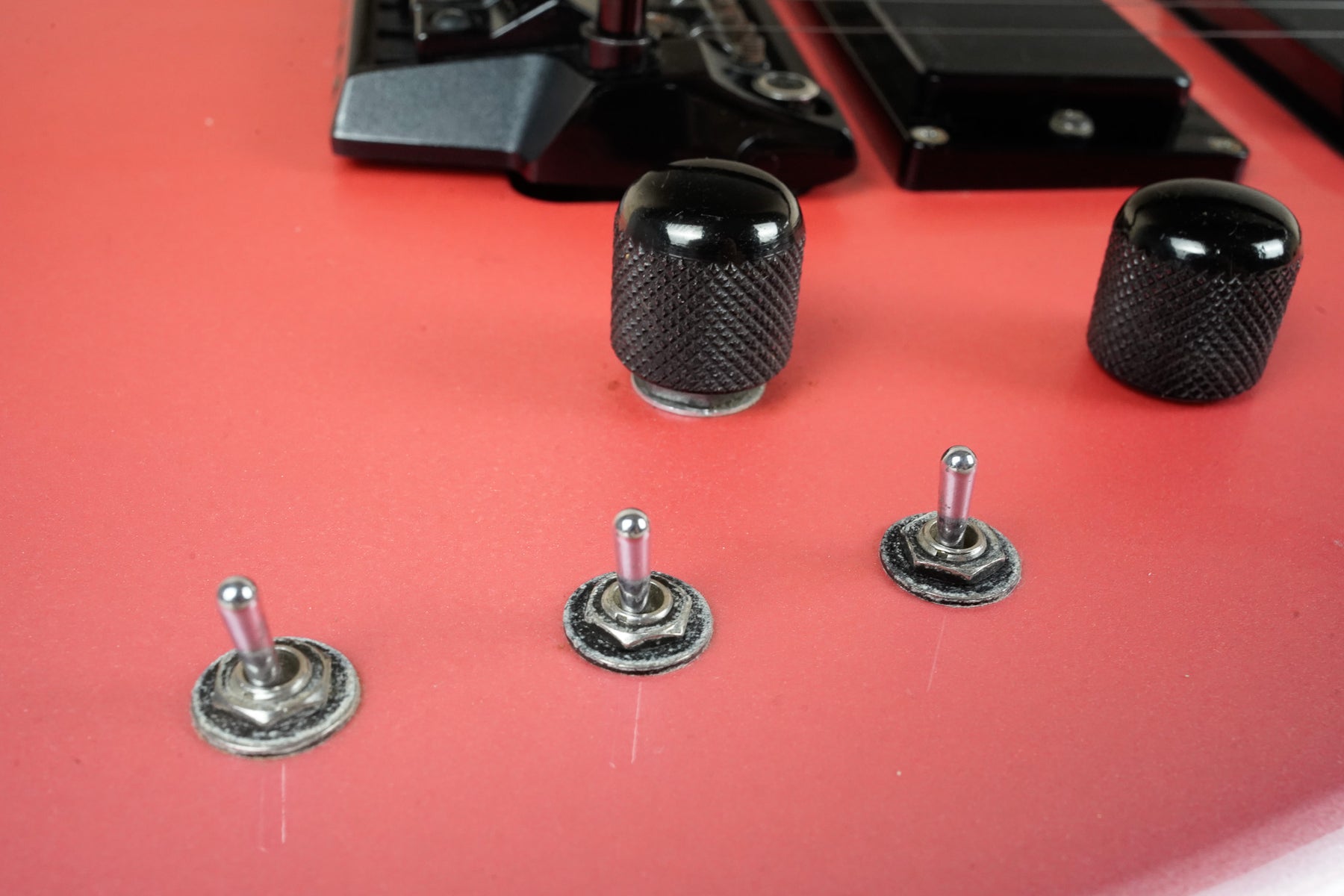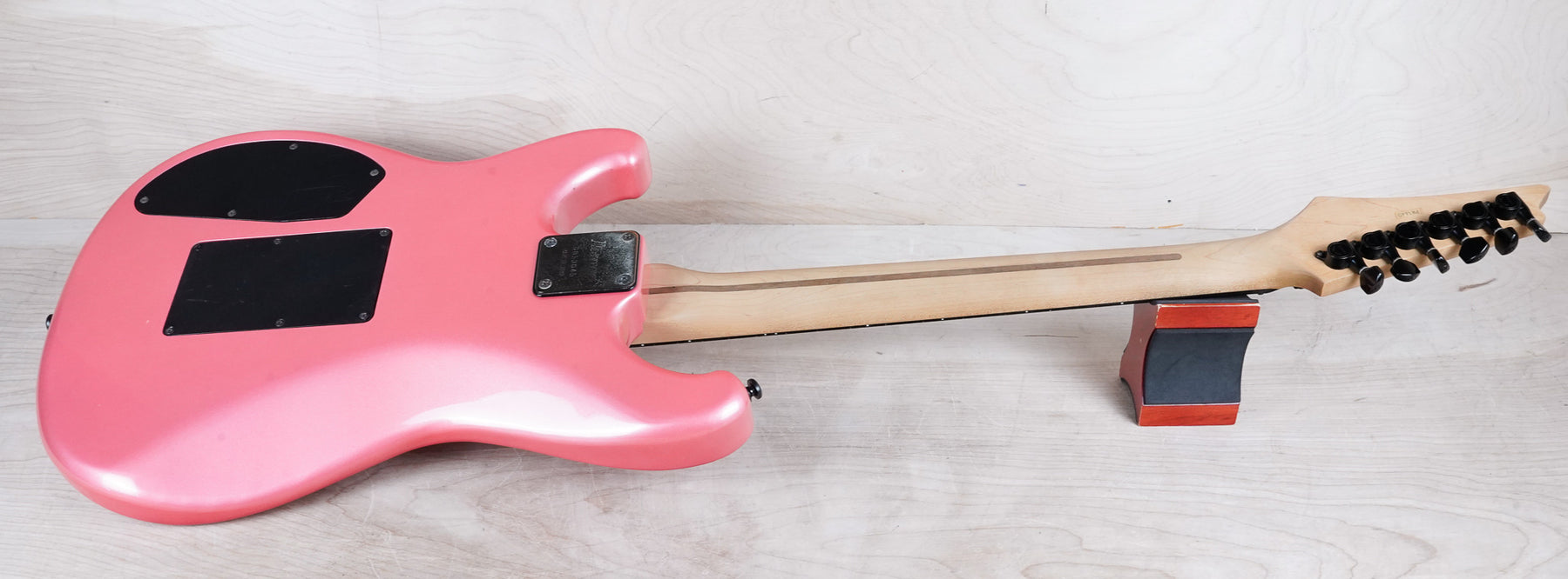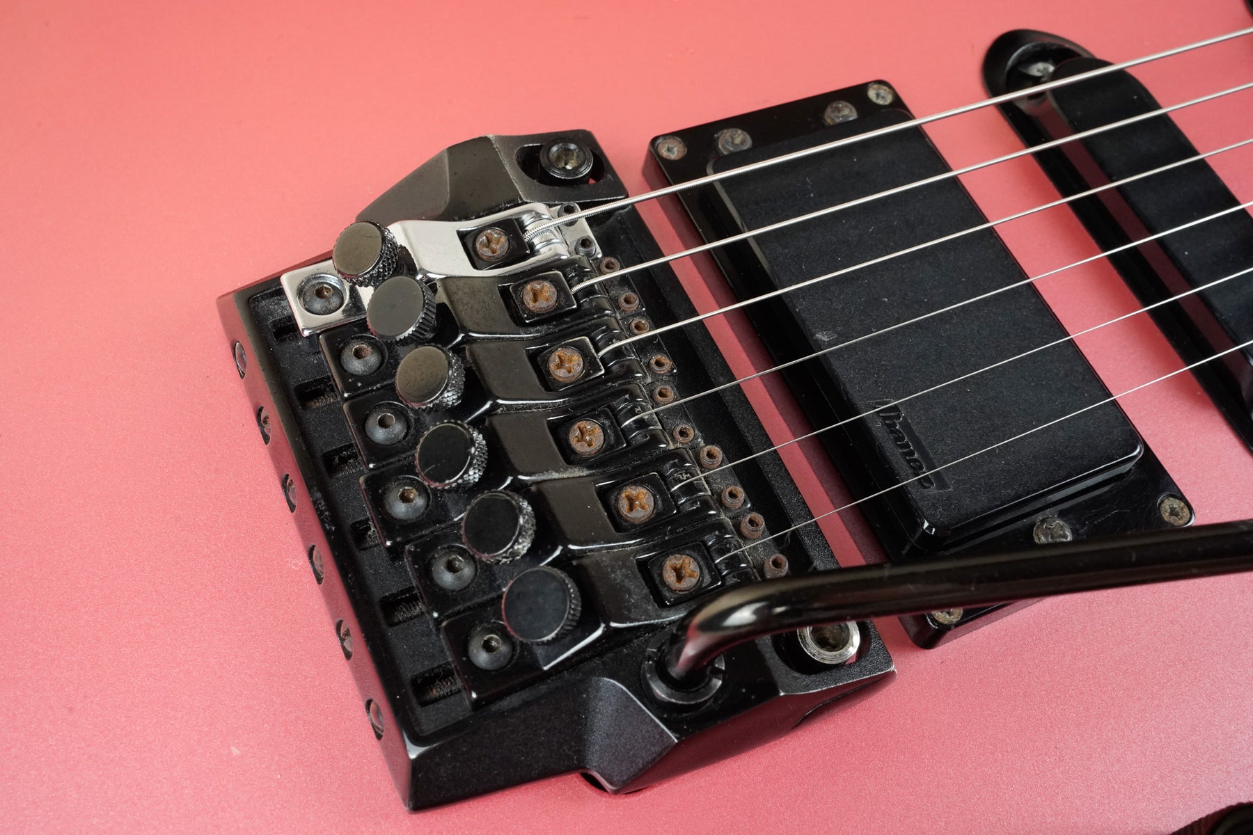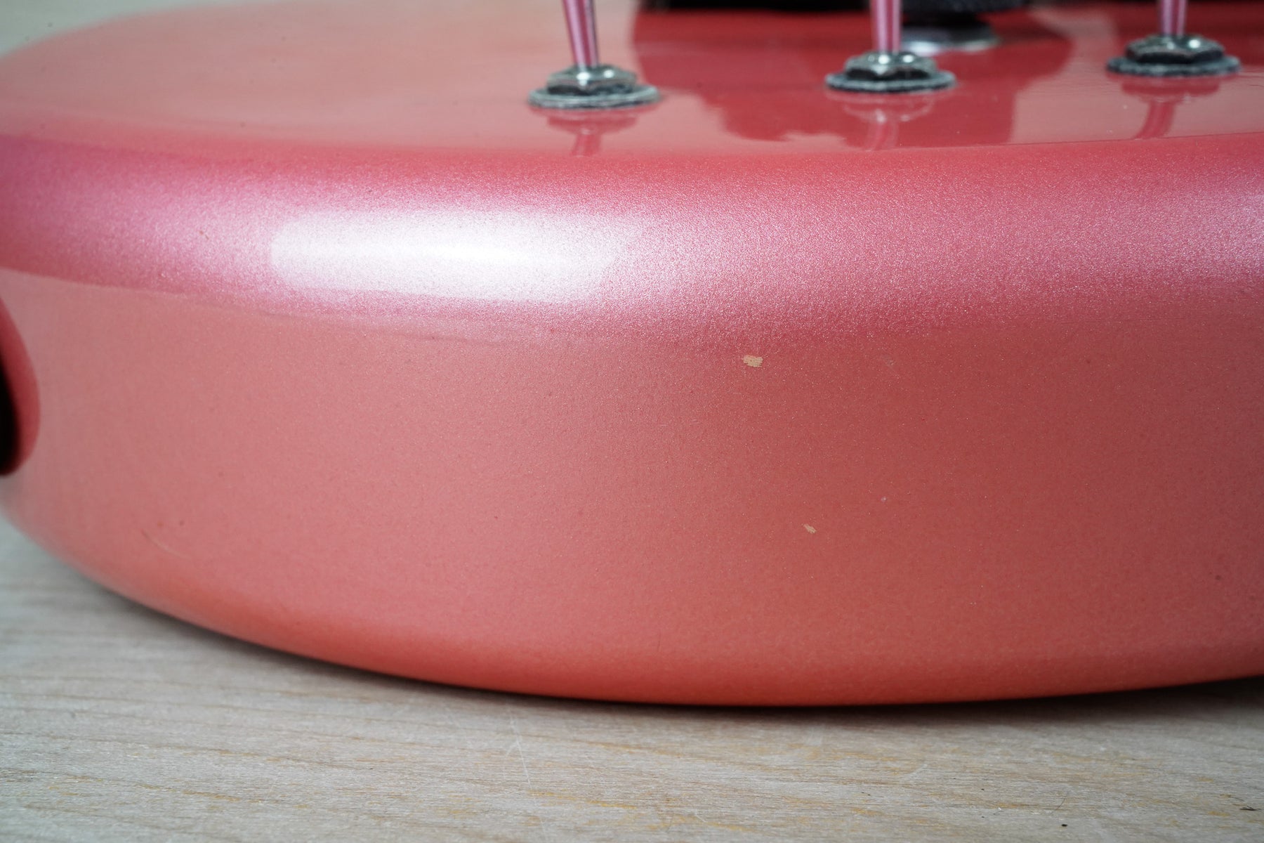 This guitar does show some cosmetic wear from over the years that includes various surface scratches, scuffs, and dents throughout the body with scuffs along the back of the neck and minor dings on the headstock. The lacquer on the back of the neck and headstock has worn from over time and the cherry ice finish has also faded slightly. The hardware shows normal tarnishing and the back spring and electronics covers have various scratches as well. The frets are still in nice shape overall and the electronics work as they should.