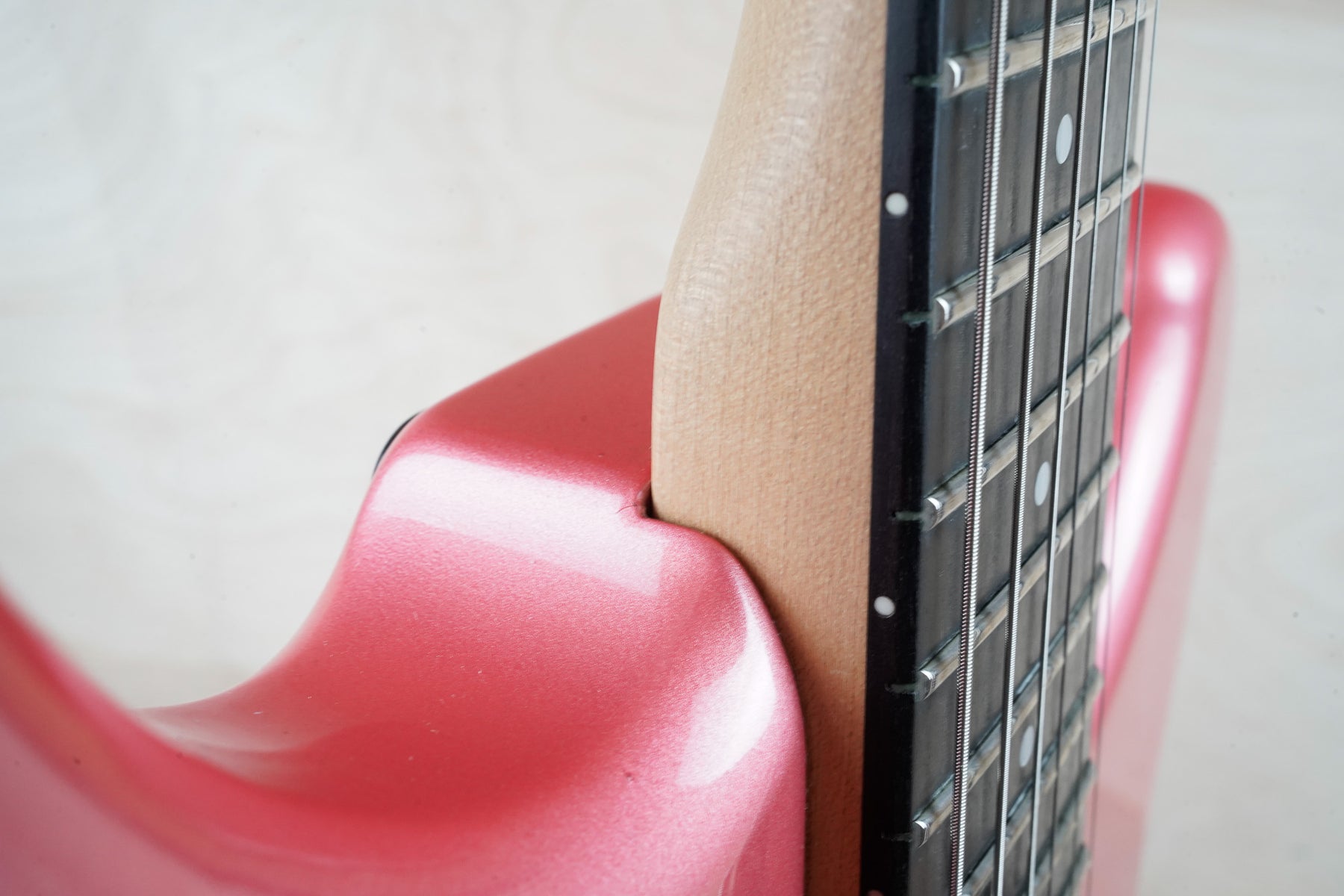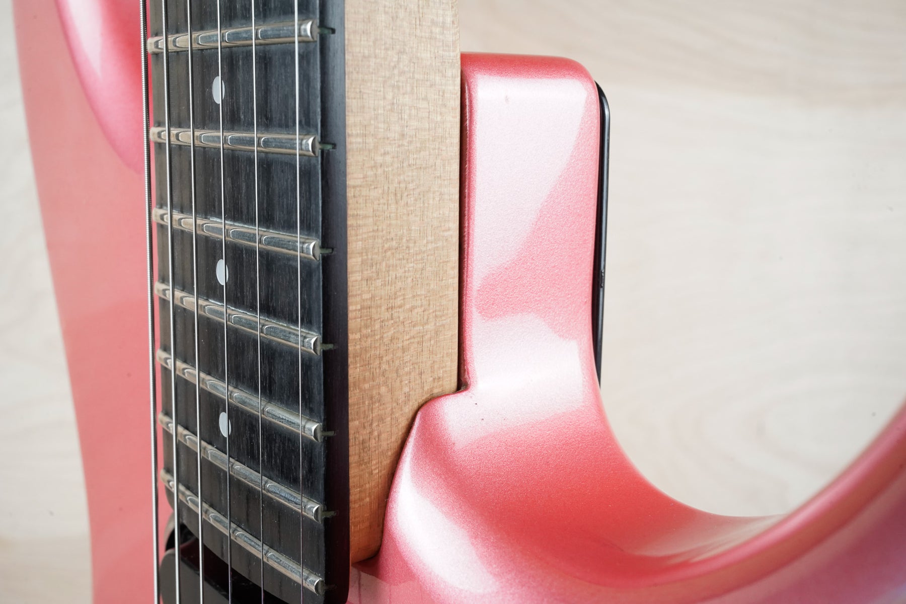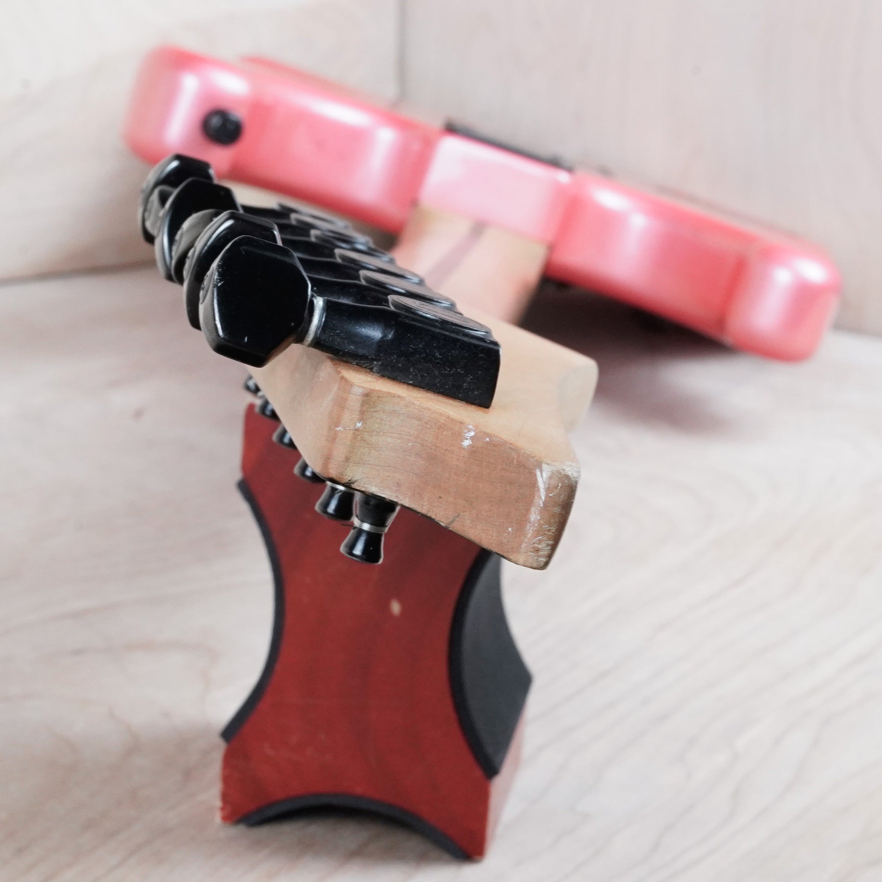 This guitar does show some cosmetic wear from over the years that includes various surface scratches, scuffs, and dents throughout the body with scuffs along the back of the neck and minor dings on the headstock. The lacquer on the back of the neck and headstock has worn from over time and the cherry ice finish has also faded slightly. The hardware shows normal tarnishing and the back spring and electronics covers have various scratches as well. The frets are still in nice shape overall and the electronics work as they should.