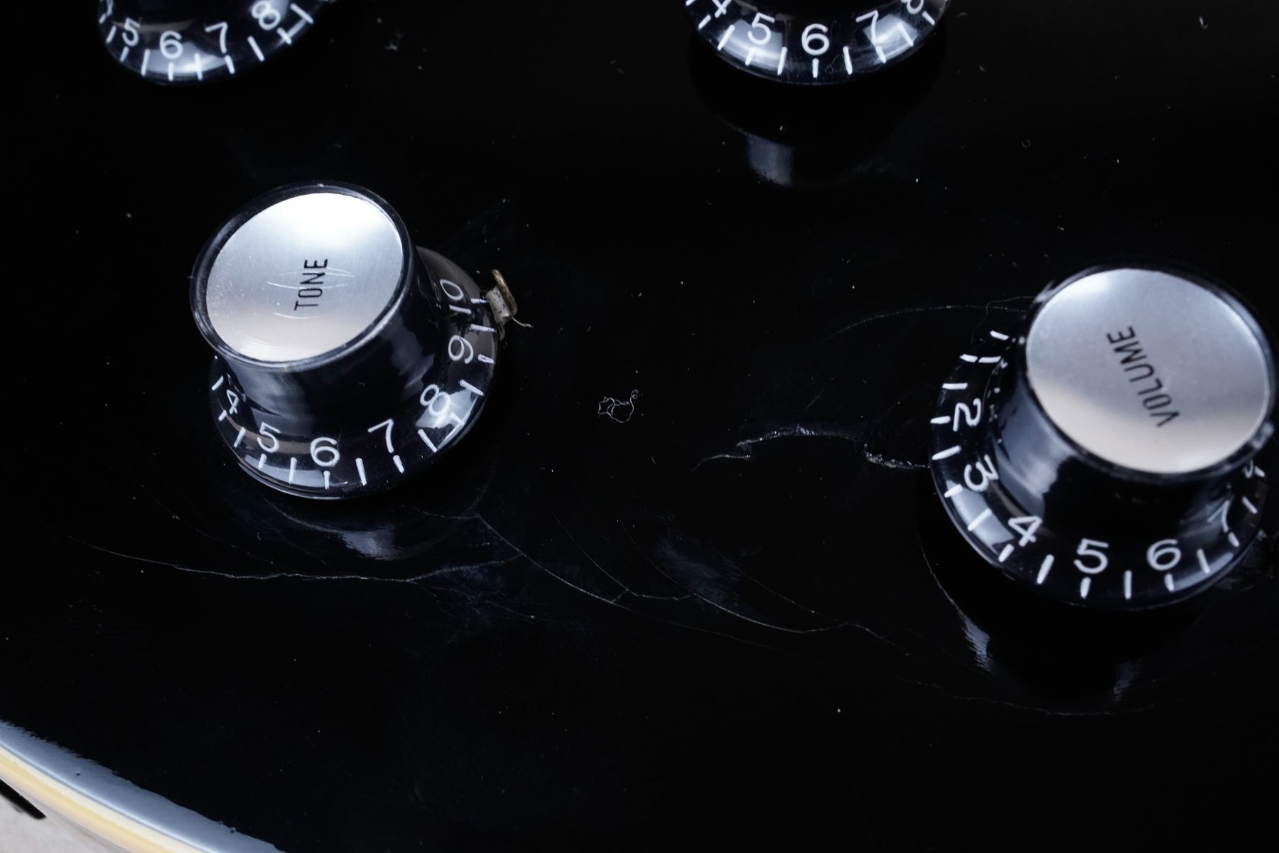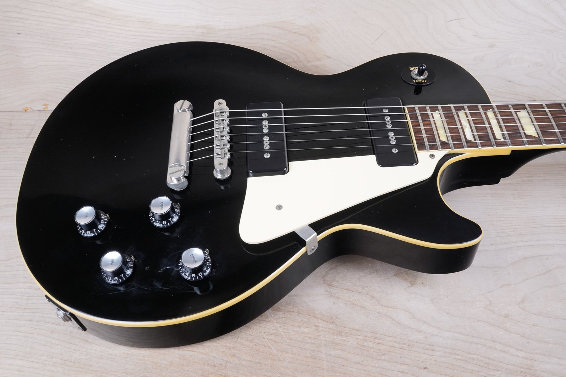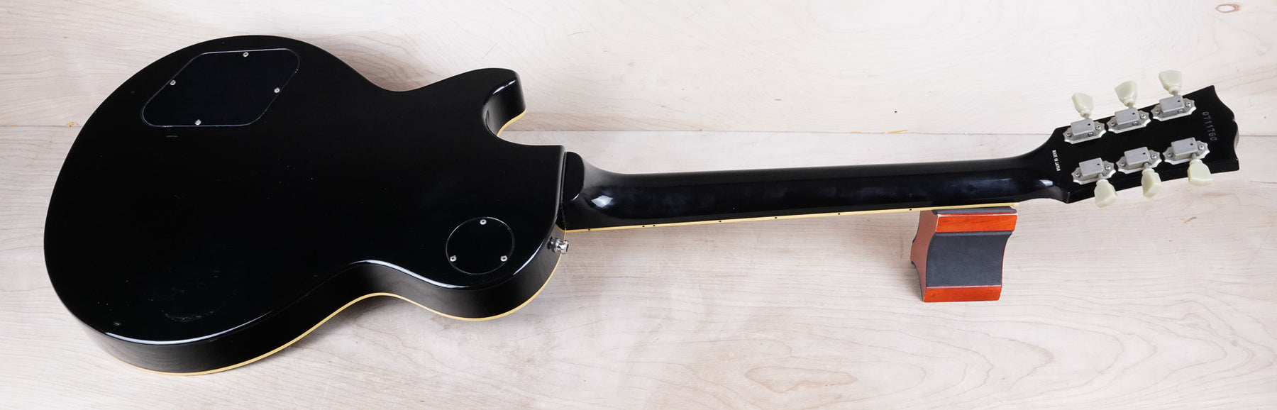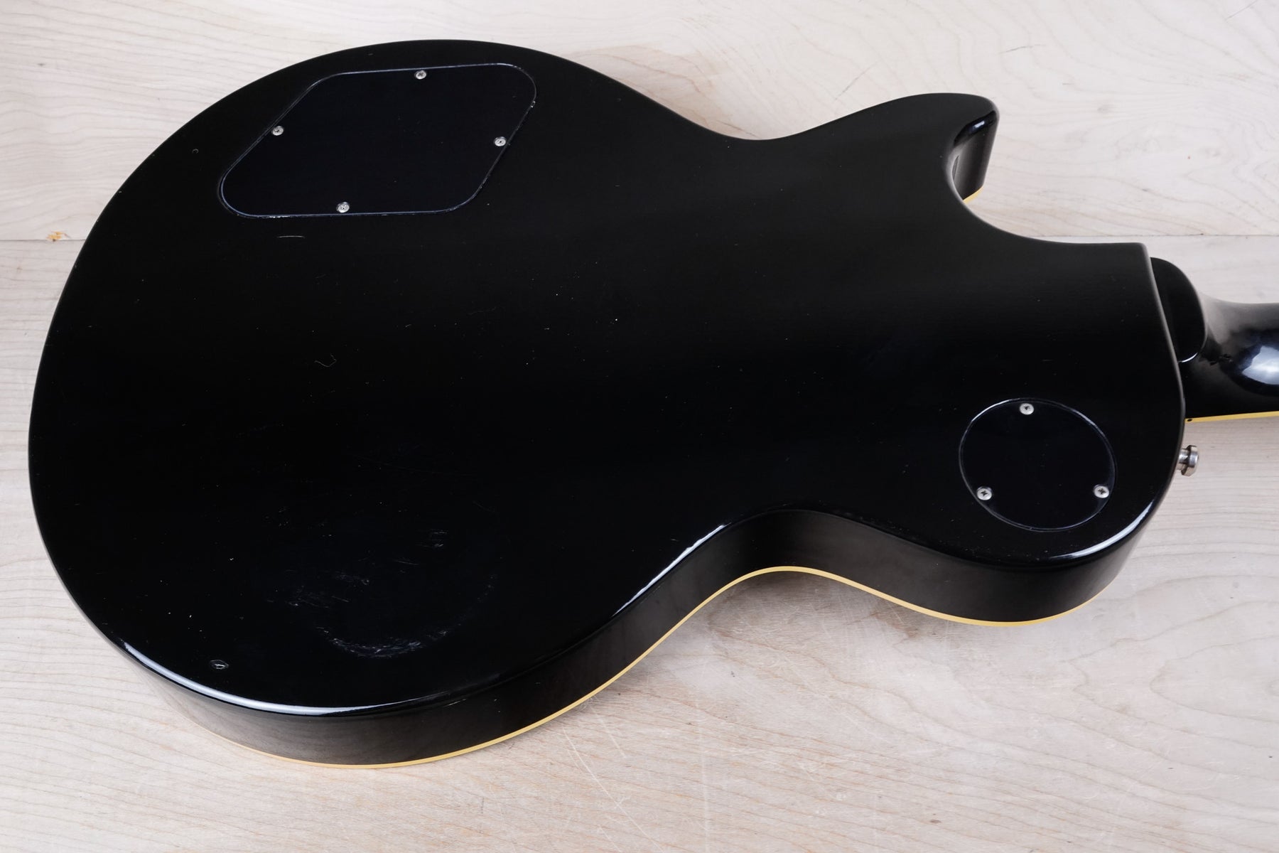 This guitar does show some cosmetic wear from over the years that includes various surface scratches, scuffs, and dents throughout the body with additional dings along the back of the neck and headstock. There's a pretty significant gash surrounded by finish cracks underneath the bridge volume knob as shown in the photos. There's also a couple sticker imprints located on the back of the body. The binding around the neck and body has yellowed from over time and the hardware shows normal tarnishing. The frets are used but still play great and the electronics work as they should.