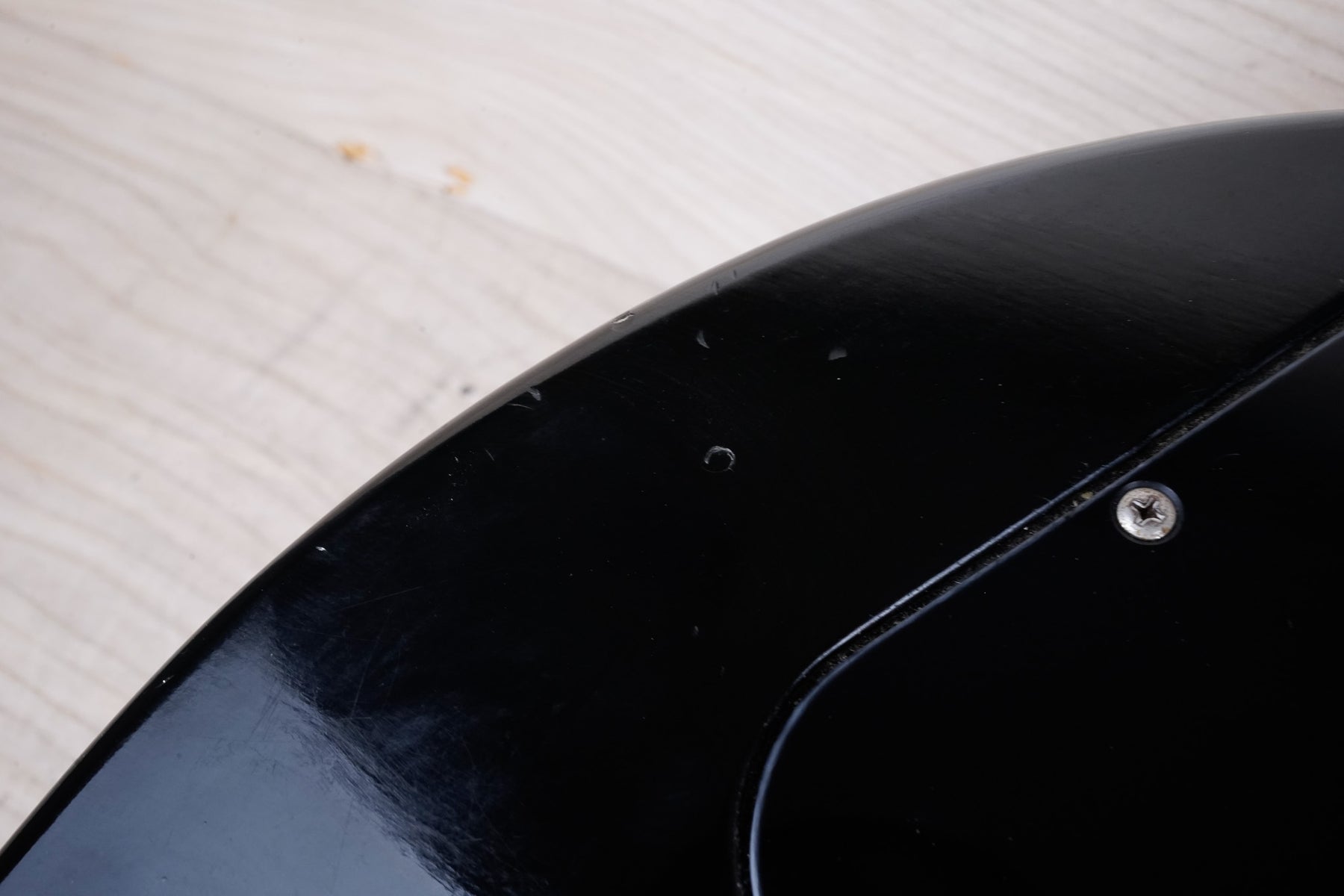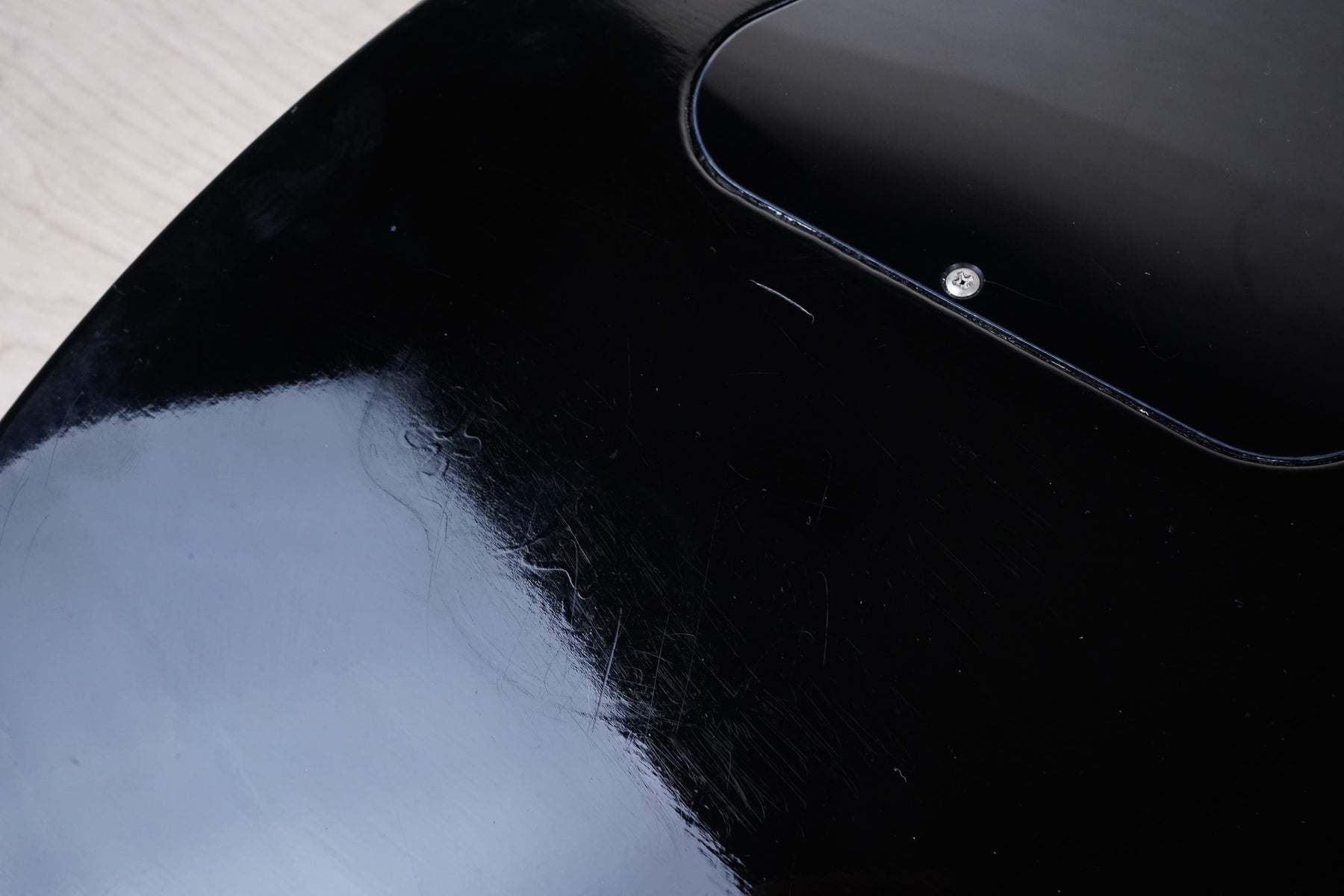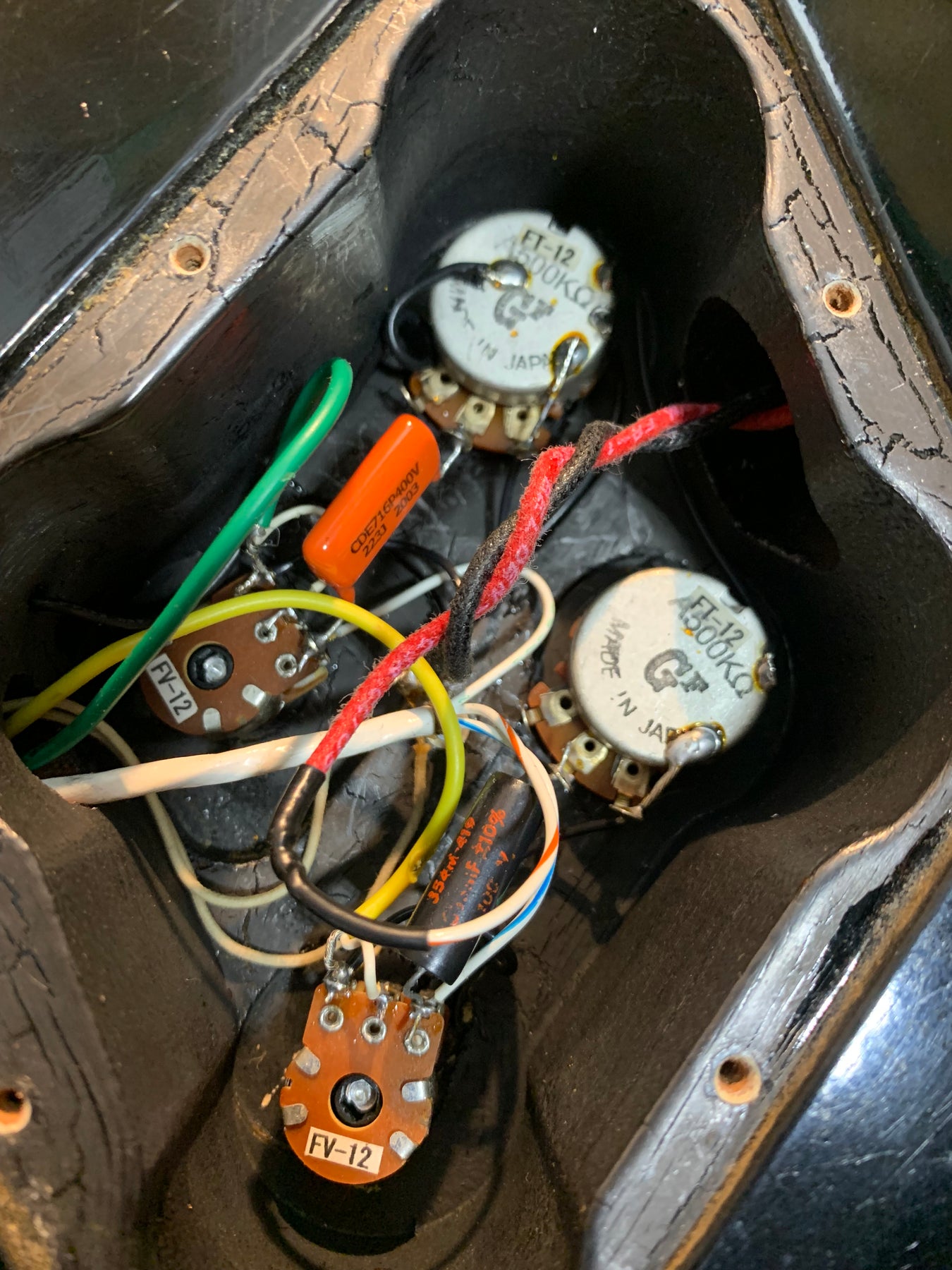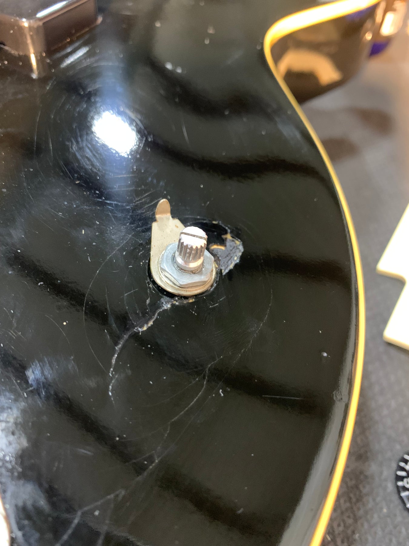 This guitar does show some cosmetic wear from over the years that includes various surface scratches, scuffs, and dents throughout the body with additional dings along the back of the neck and headstock. There's a pretty significant gash surrounded by finish cracks underneath the bridge volume knob as shown in the photos. There's also a couple sticker imprints located on the back of the body. The binding around the neck and body has yellowed from over time and the hardware shows normal tarnishing. The frets are used but still play great and the electronics work as they should.