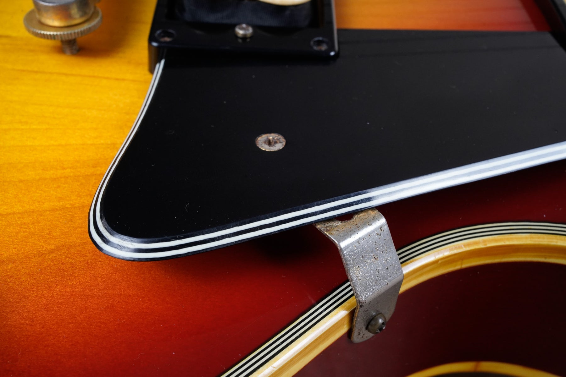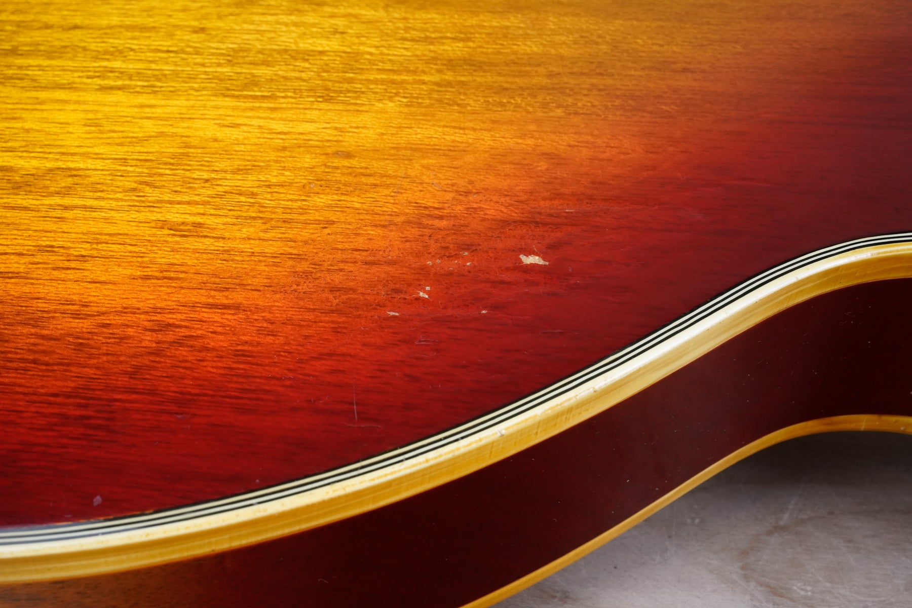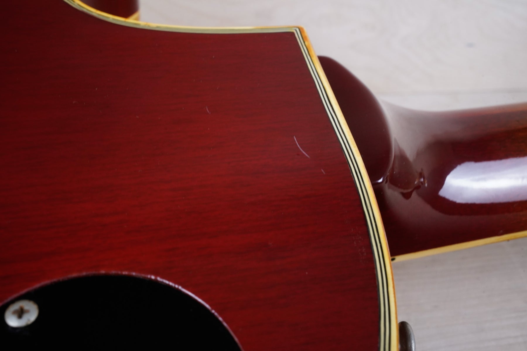 This guitar does show some cosmetic wear from over the years that includes various surface scratches, scuffs, and dents throughout the body with additional scratches and dings along the back of the neck and headstock. The gold hardware shows normal tarnishing and the binding has yellowed from over time. The binding is aged throughout. The frets have some normal play wear as you would expect for the guitars age, but they play great! The electronics work as they should.