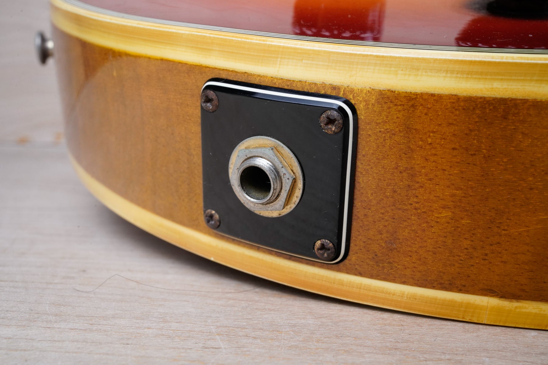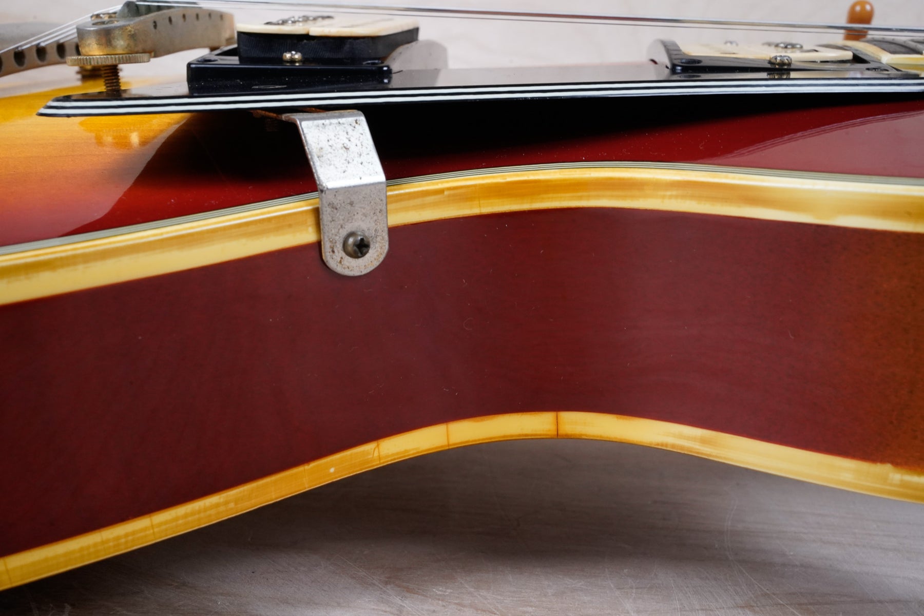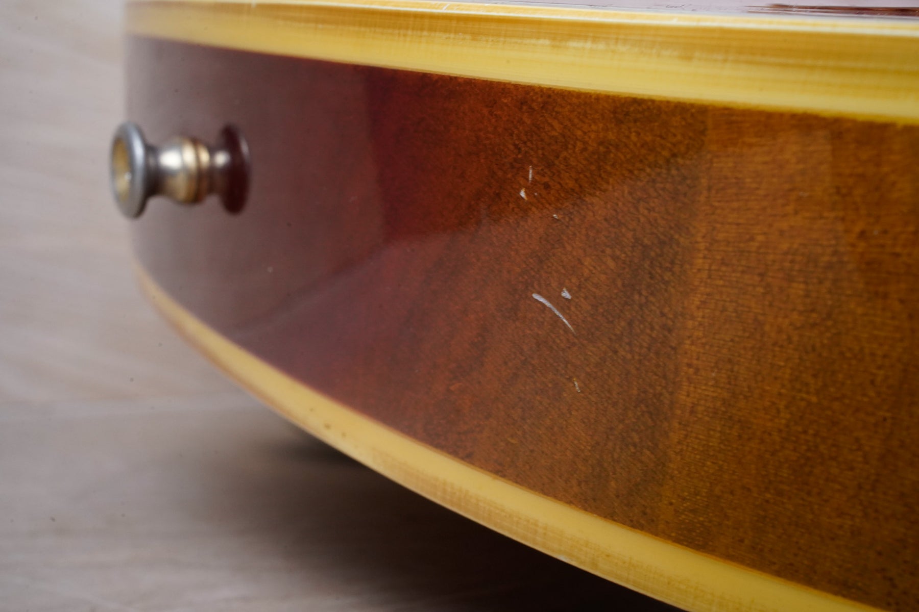 This guitar does show some cosmetic wear from over the years that includes various surface scratches, scuffs, and dents throughout the body with additional scratches and dings along the back of the neck and headstock. The gold hardware shows normal tarnishing and the binding has yellowed from over time. The binding is aged throughout. The frets have some normal play wear as you would expect for the guitars age, but they play great! The electronics work as they should.