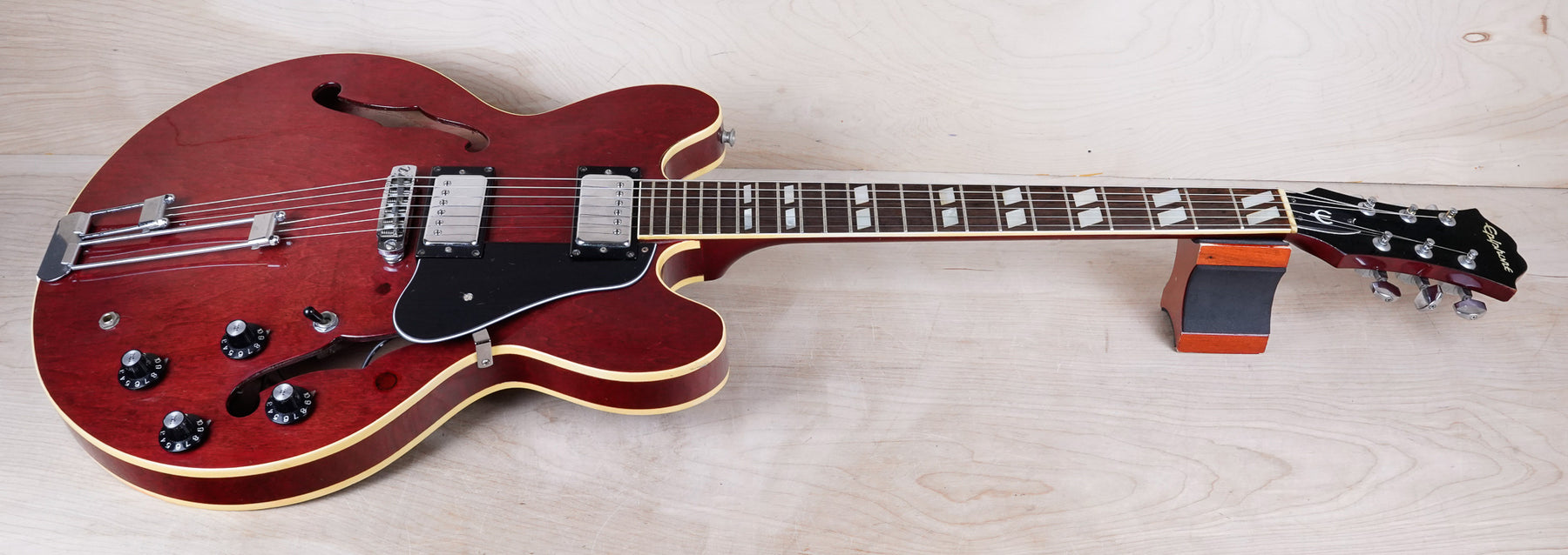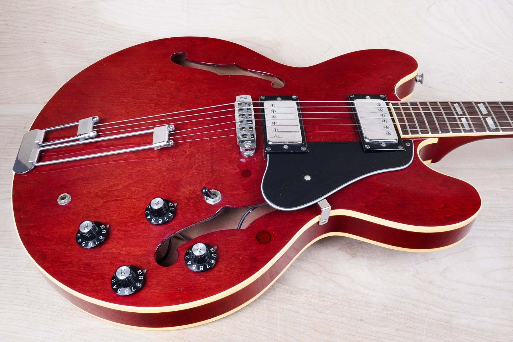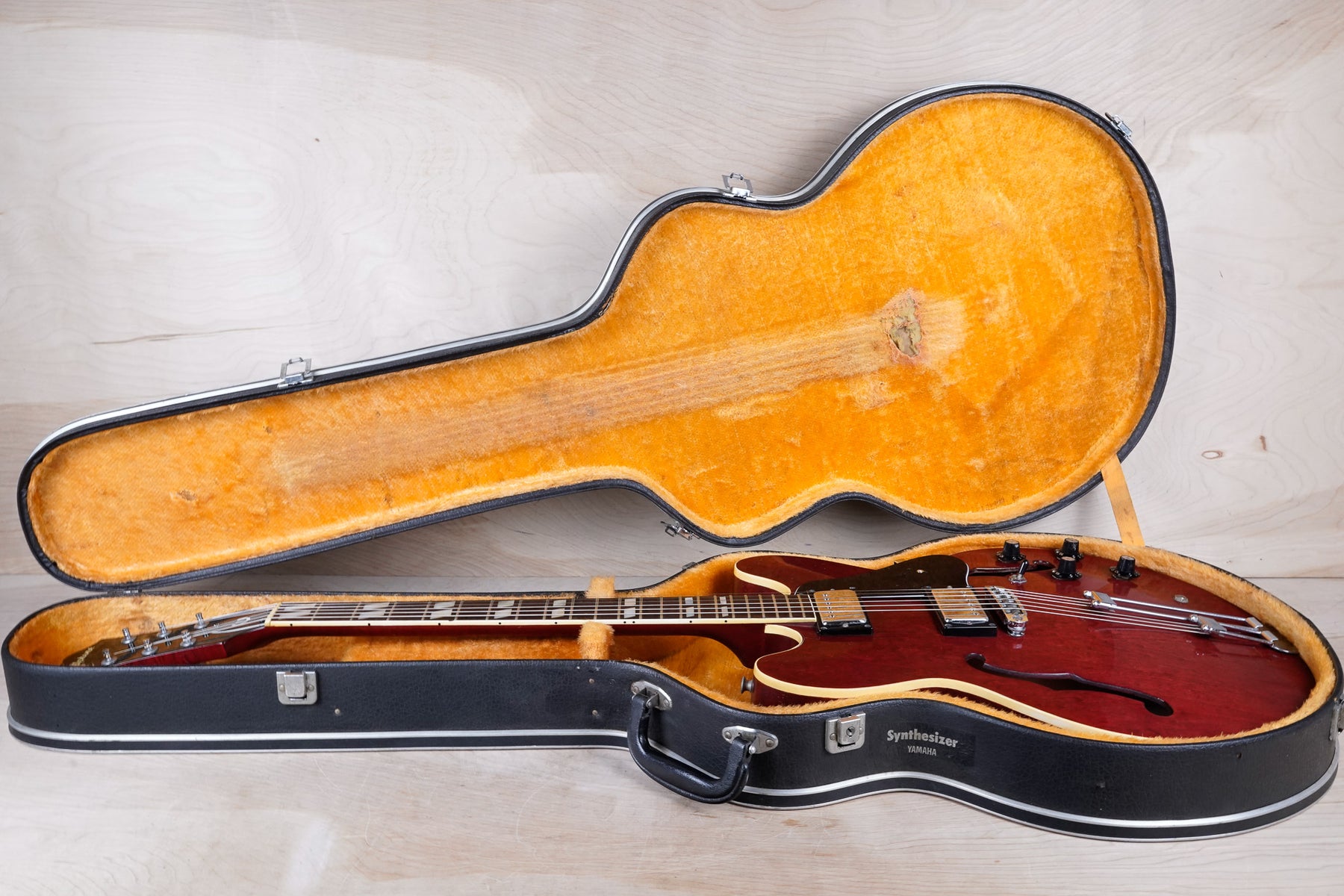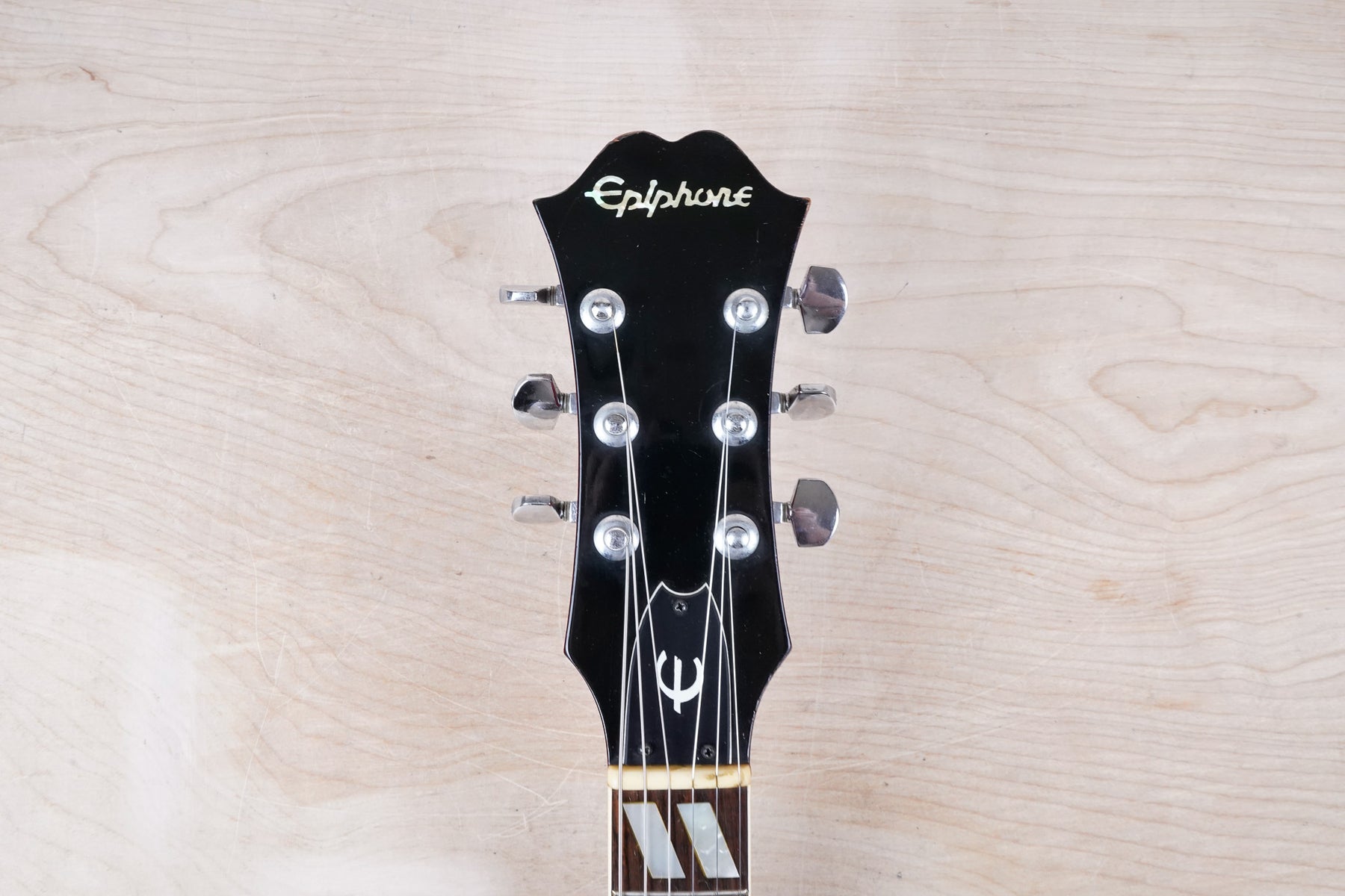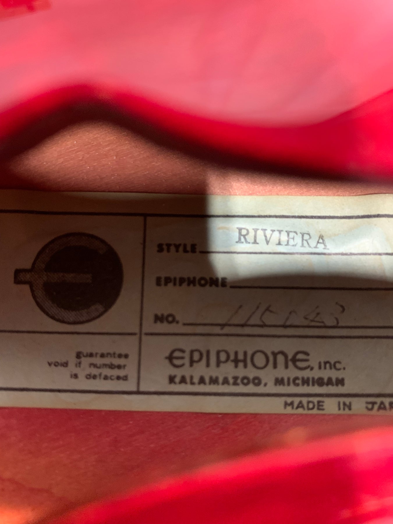 This vintage Japanese domestic Epiphone Riviera plays and sounds great! This guitar was produced in the Matsumoku Factory as an alternative to the Norlin Era 335 models. The guitar is comprised of a maple top, body, and neck with a rosewood fretboard and well sought-after Maxon humbuckers.