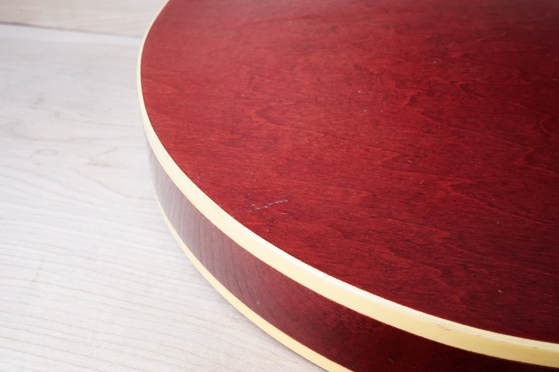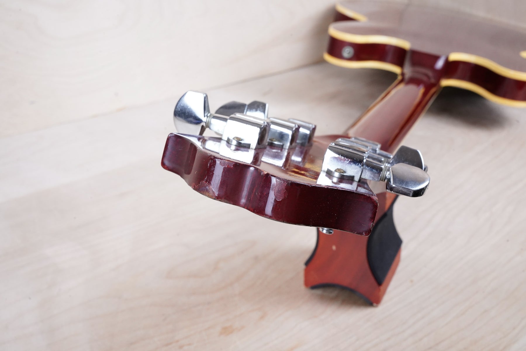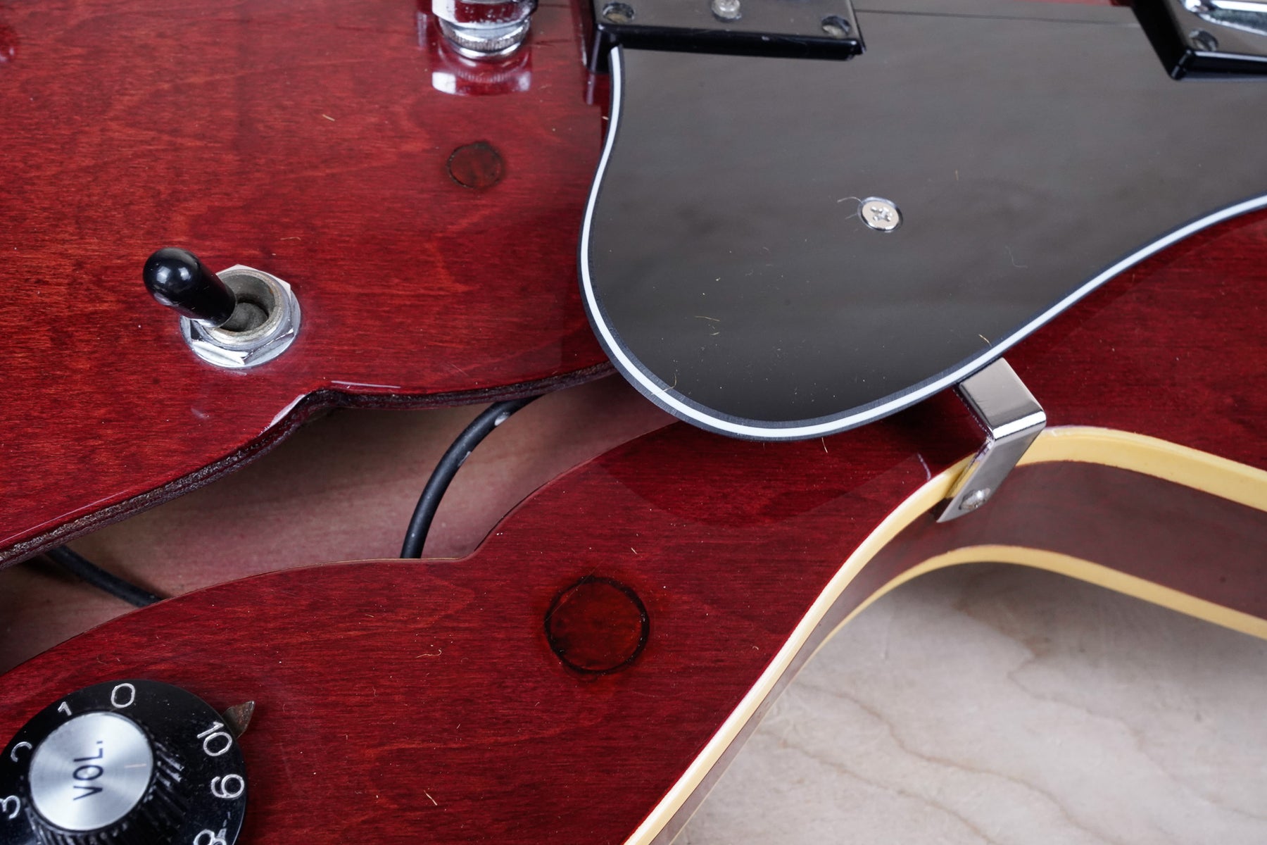 This guitar does show quite a bit of cosmetic wear from over the years that includes various surface scratches, scuffs, and dents throughout the body with additional dings on the headstock. There's also 3 holes that have been filled by our trusted luthier, Tom Jacobs of Jacobs Custom Guitars. Two of these holes are visible on the front of the body and one of the tone pot holes had been widened at one point in time. The hardware shows normal tarnishing and the binding around the neck and body has yellowed and chipped from over time. The binding has slightly lifted on the top in one of the cutaways as shown. This guitar retains its original frets, which still play great, but are lower, likely from a few fret levels over the years. All of the electronics work as they should.