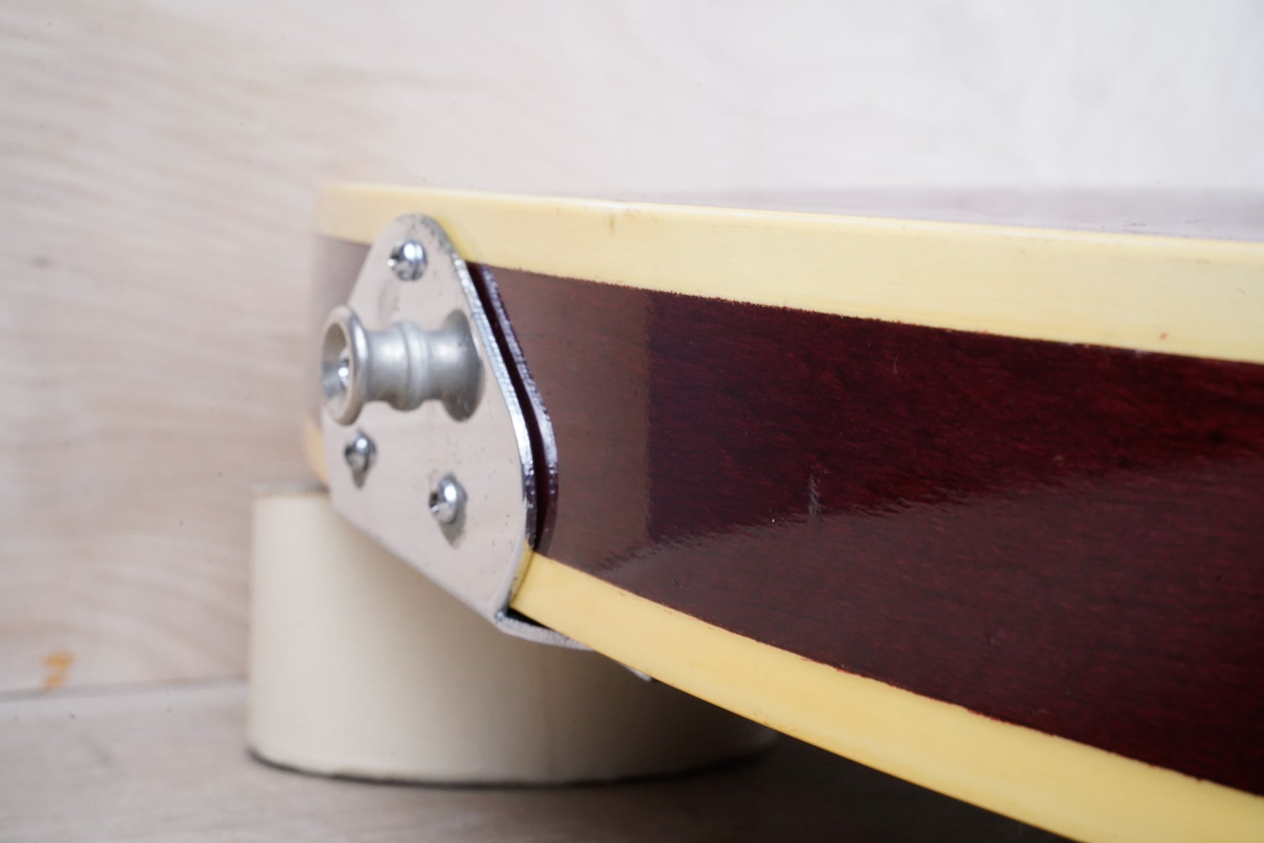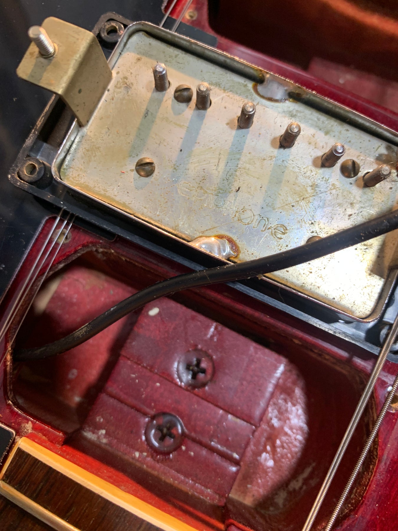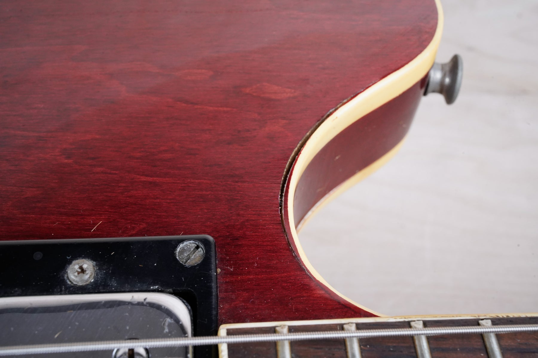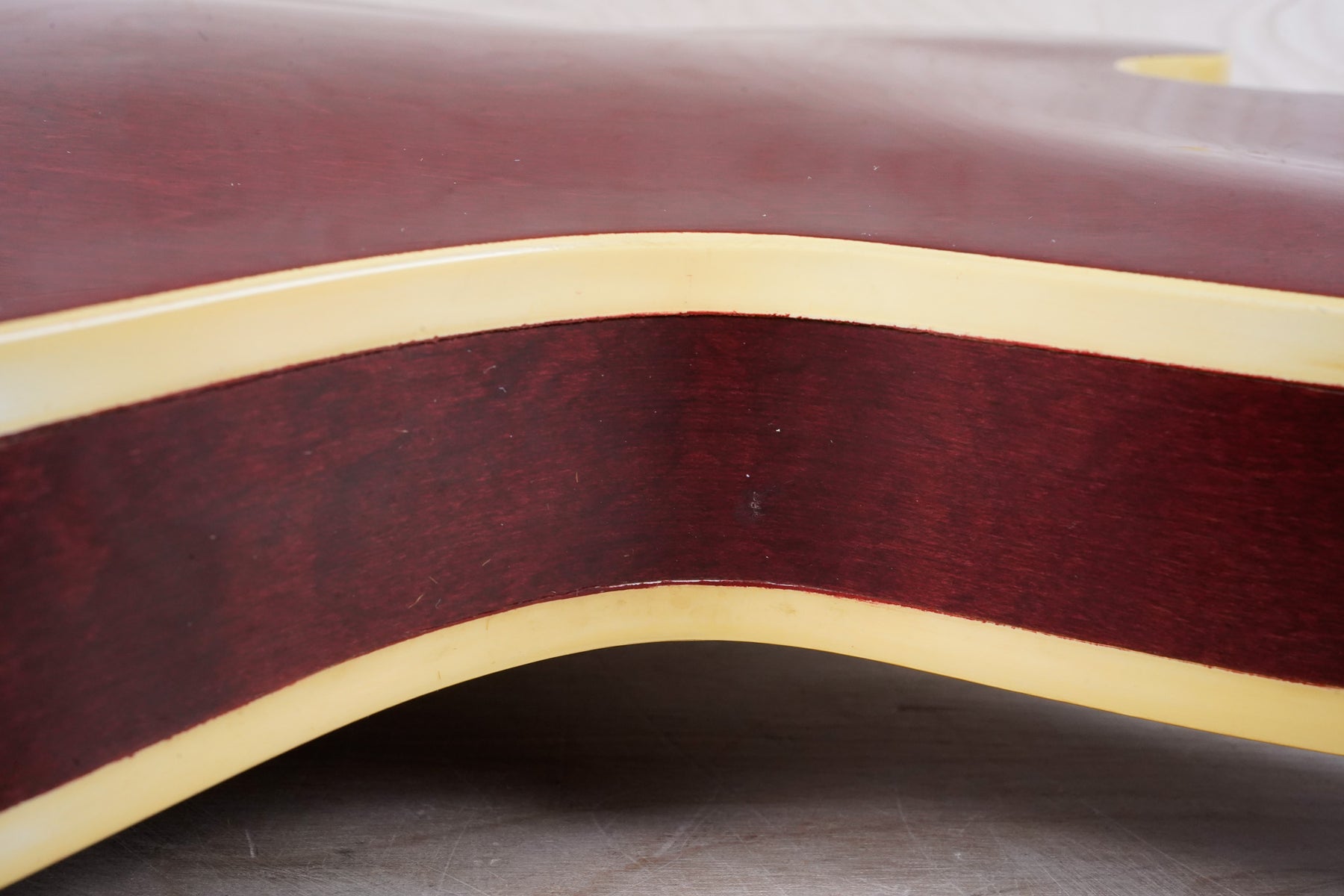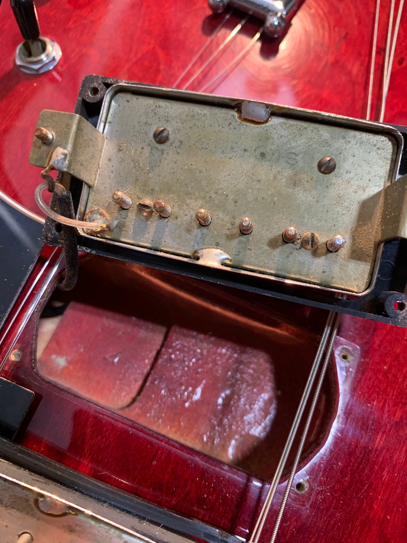 The pickguard and volume/tone knobs are later replacements. As noted, previously drilled holes have now been filled. The guitar is otherwise original. For context, the holes are from a priorly installed battery power amp-style light that was since removed. This light existed separately from the electronics, and the existing electronics appear unchanged.