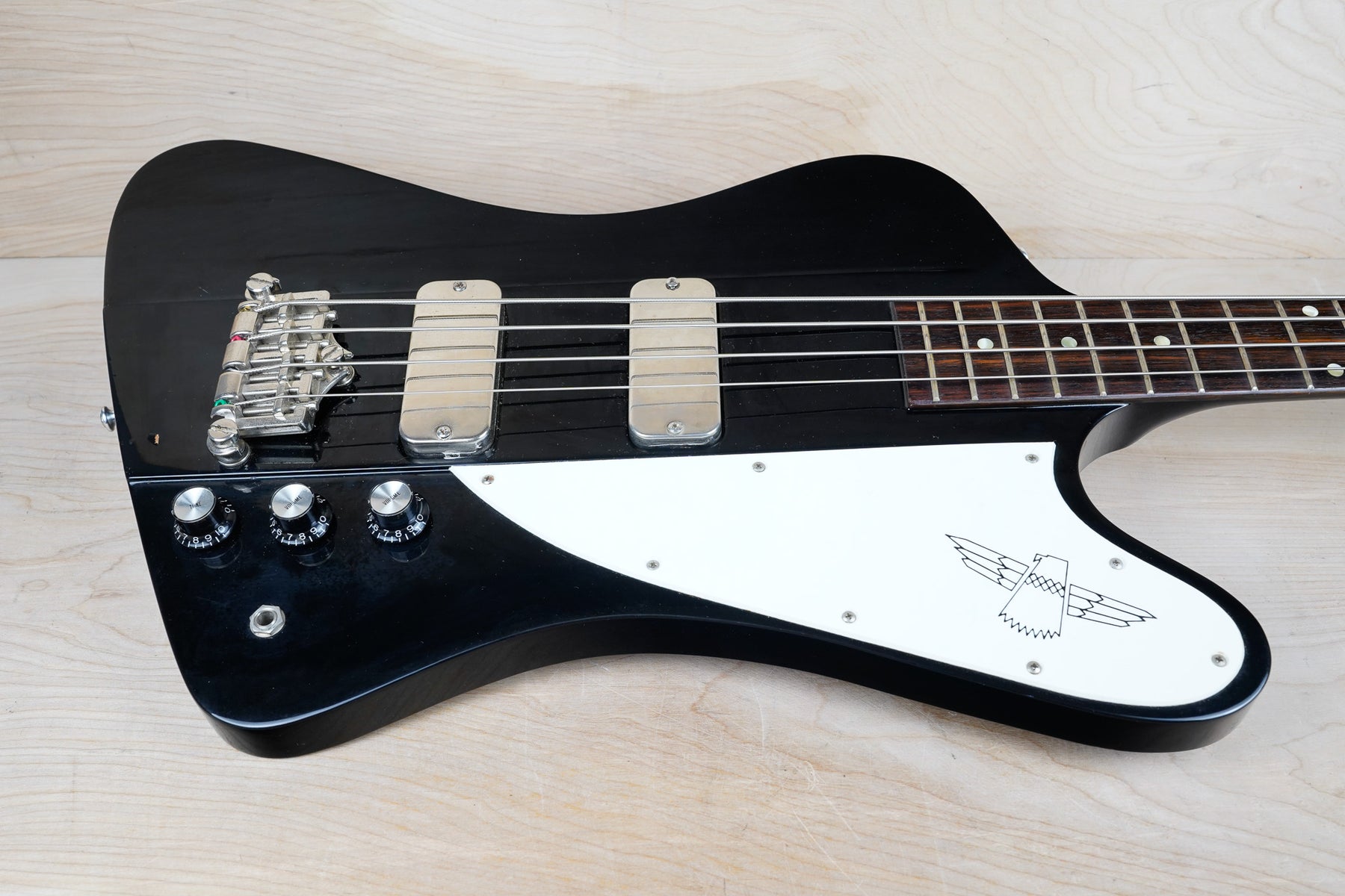 This 1990 Orville by Gibson Thunderbird plays and sounds great! The neck has a slim '60s profile and the humbuckers provide a very rich and full tone. This higher-tiered "Orville by Gibson" sports a gloss lacquer finish, and factory-equipped USA Gibson pickups.