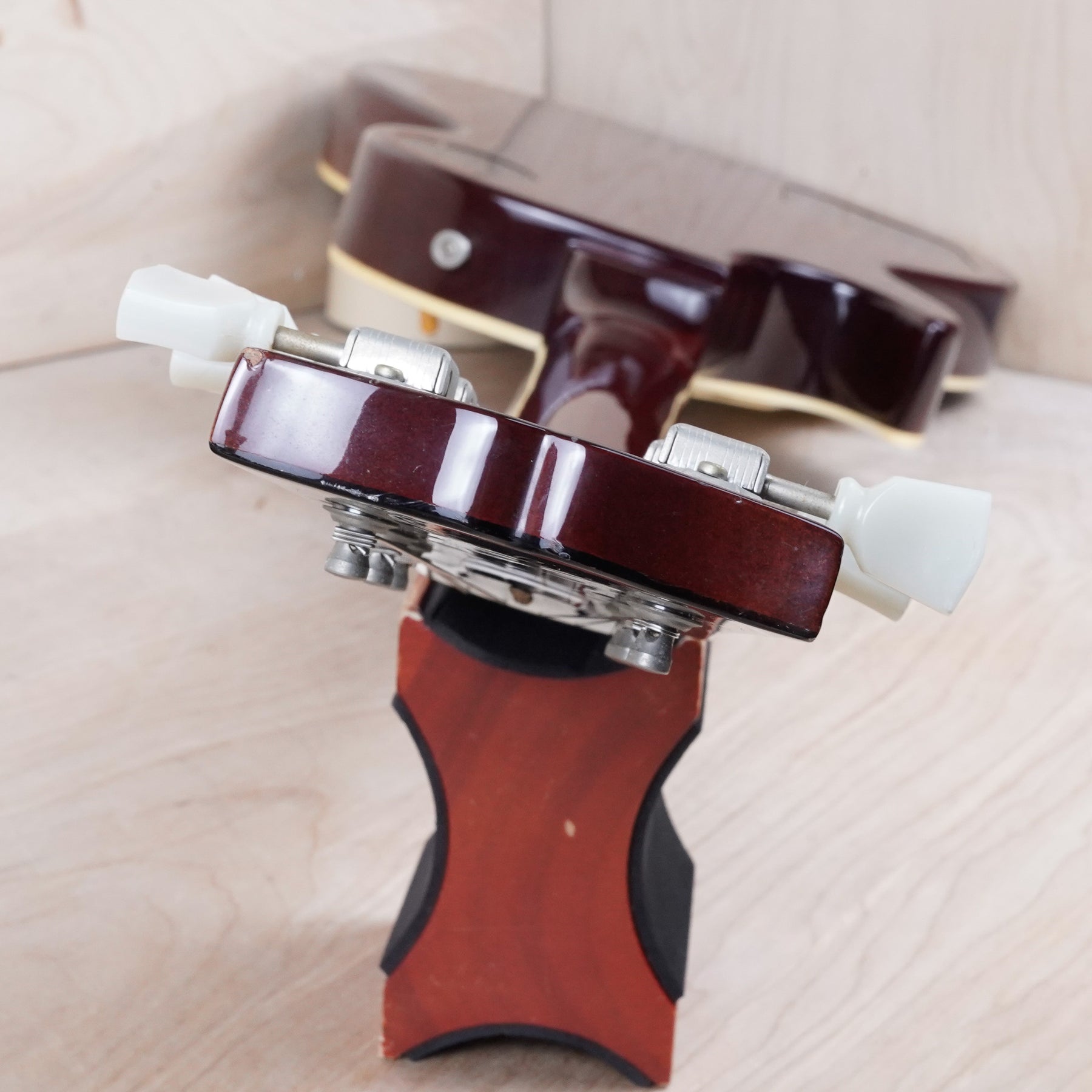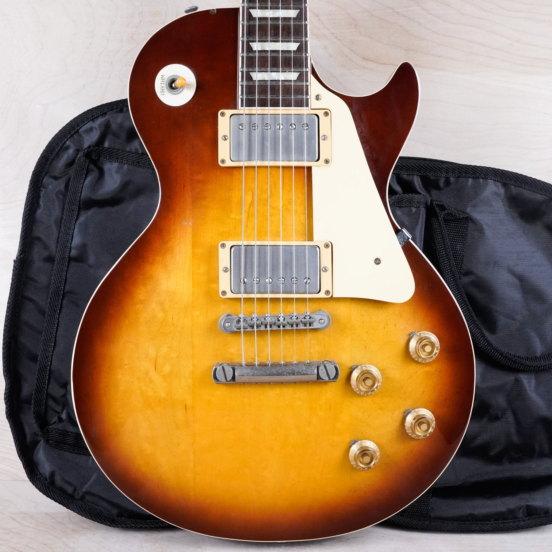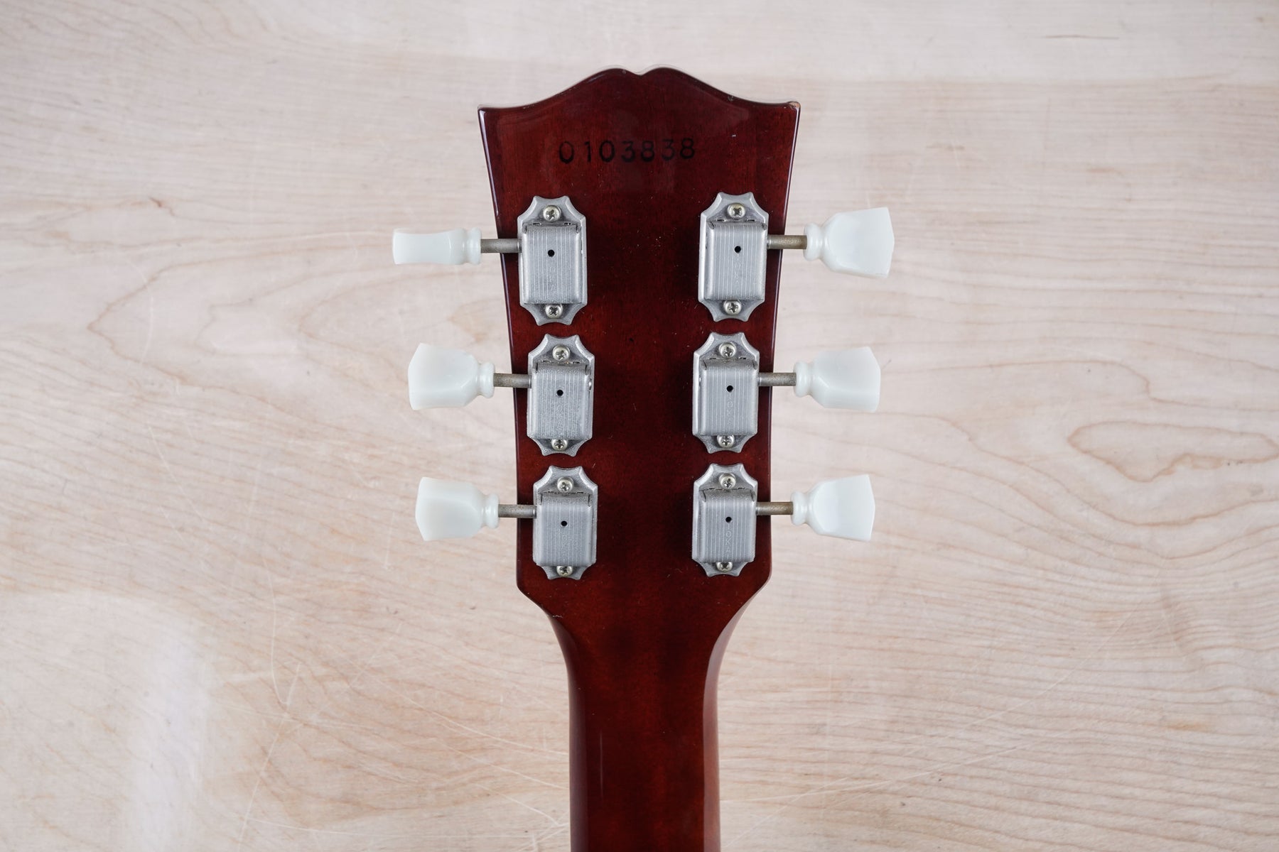 The pickups have been swapped for a set of 1970s Maxon PAF style pickups. The pickguard, tail piece, and truss rod cover are later replacements. This guitar otherwise appears to be original.