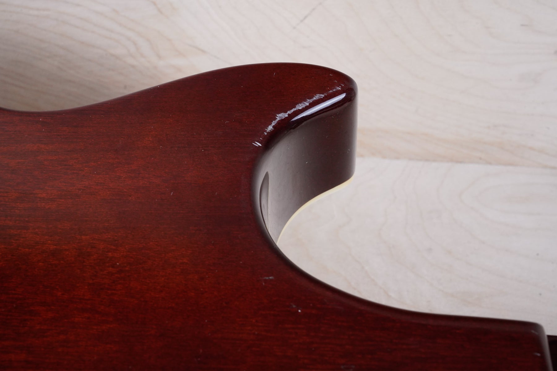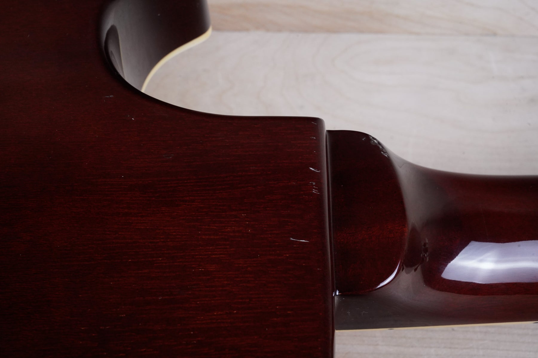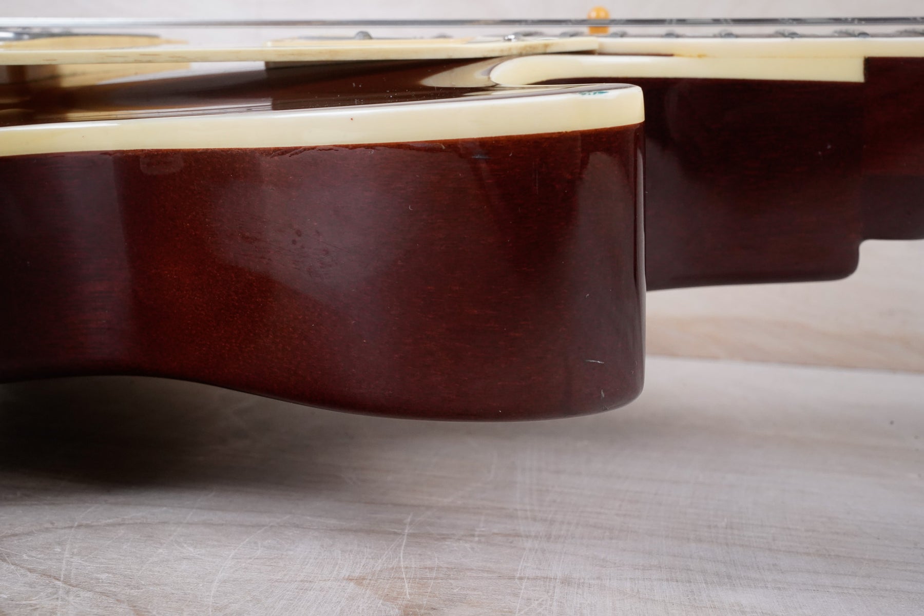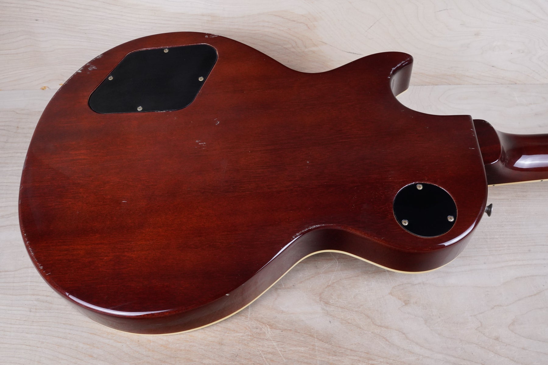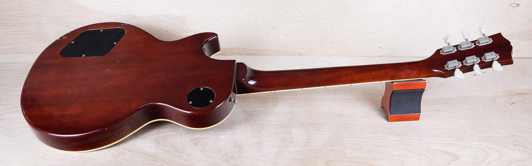 This guitar does show quite a bit of cosmetic wear from over the years that includes various surface scratches, scuffs, and dents throughout the body with additional wear along the back of the neck and headstock. There's a small chip located on the side of the upper bout and there's a small chip on the 12th fret inlay. The fretboard is scuffed in that particular area on the 12th fret. The lacquer finish on the headstock face shows some discoloration from over time. The pickup rings and binding around the neck and body have also yellowed and the hardware shows quite a bit of tarnish from over time. The frets are used but otherwise still play great and the electronics work as they should.