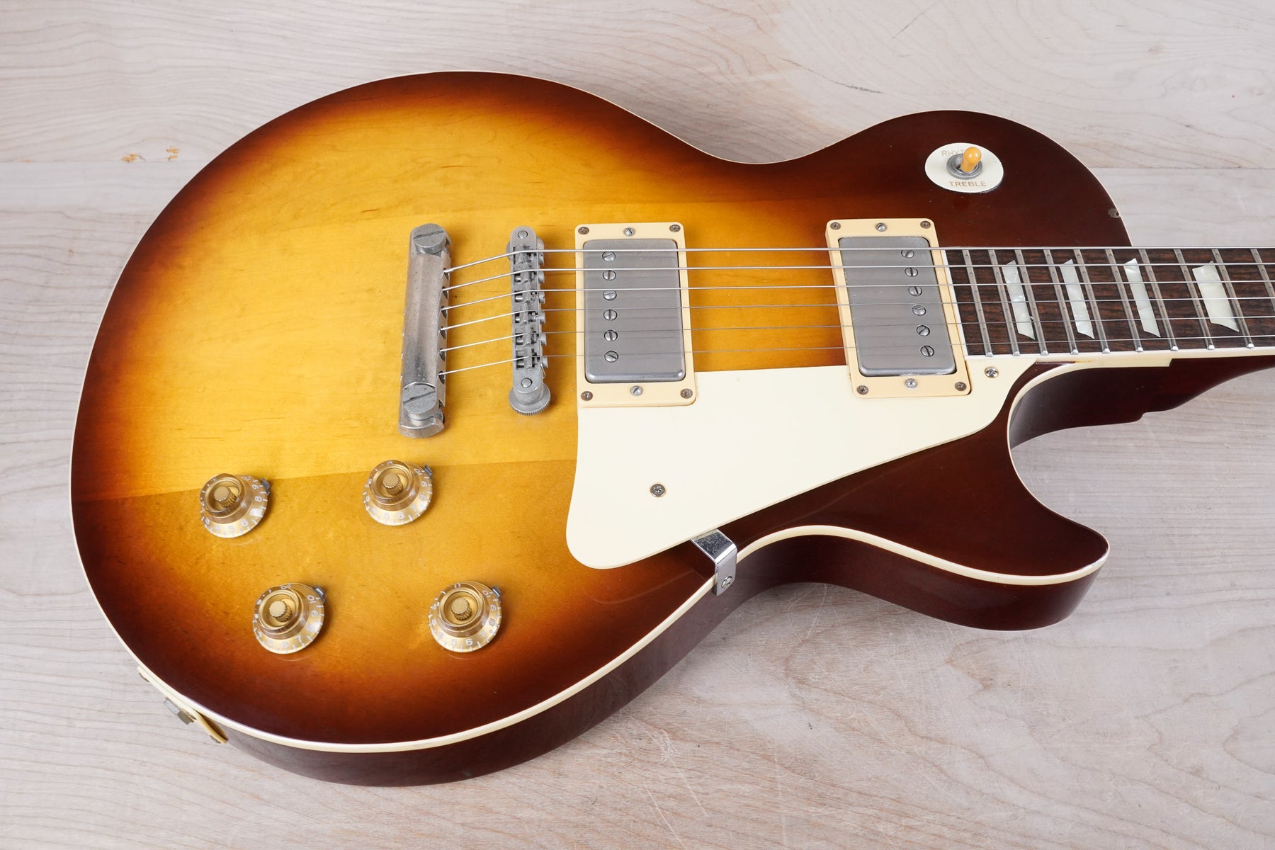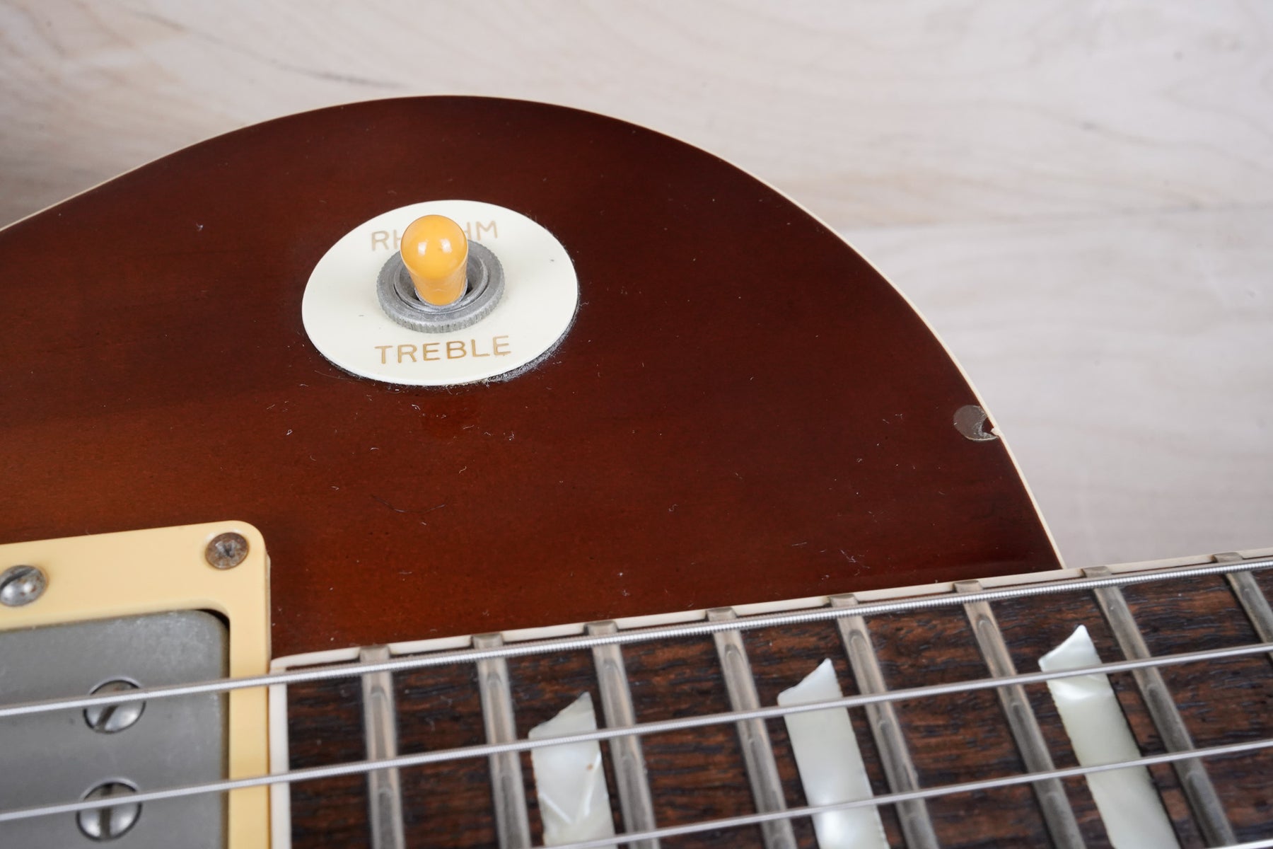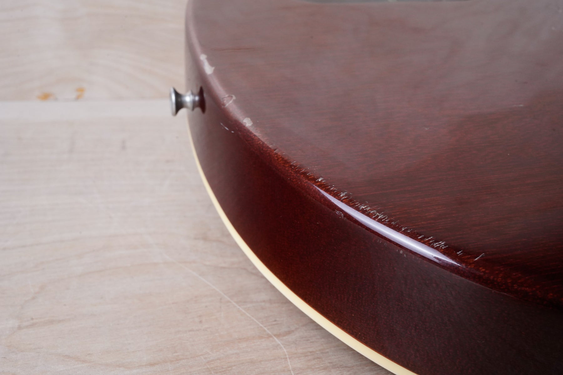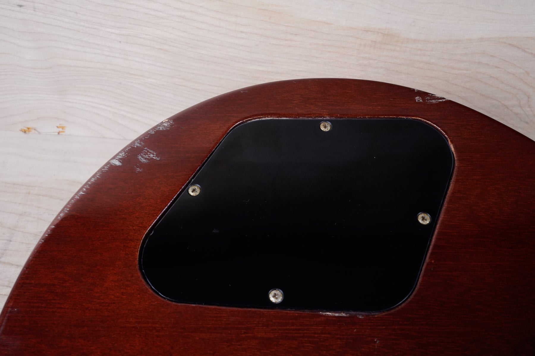 This guitar does show quite a bit of cosmetic wear from over the years that includes various surface scratches, scuffs, and dents throughout the body with additional wear along the back of the neck and headstock. There's a small chip located on the side of the upper bout and there's a small chip on the 12th fret inlay. The fretboard is scuffed in that particular area on the 12th fret. The lacquer finish on the headstock face shows some discoloration from over time. The pickup rings and binding around the neck and body have also yellowed and the hardware shows quite a bit of tarnish from over time. The frets are used but otherwise still play great and the electronics work as they should.