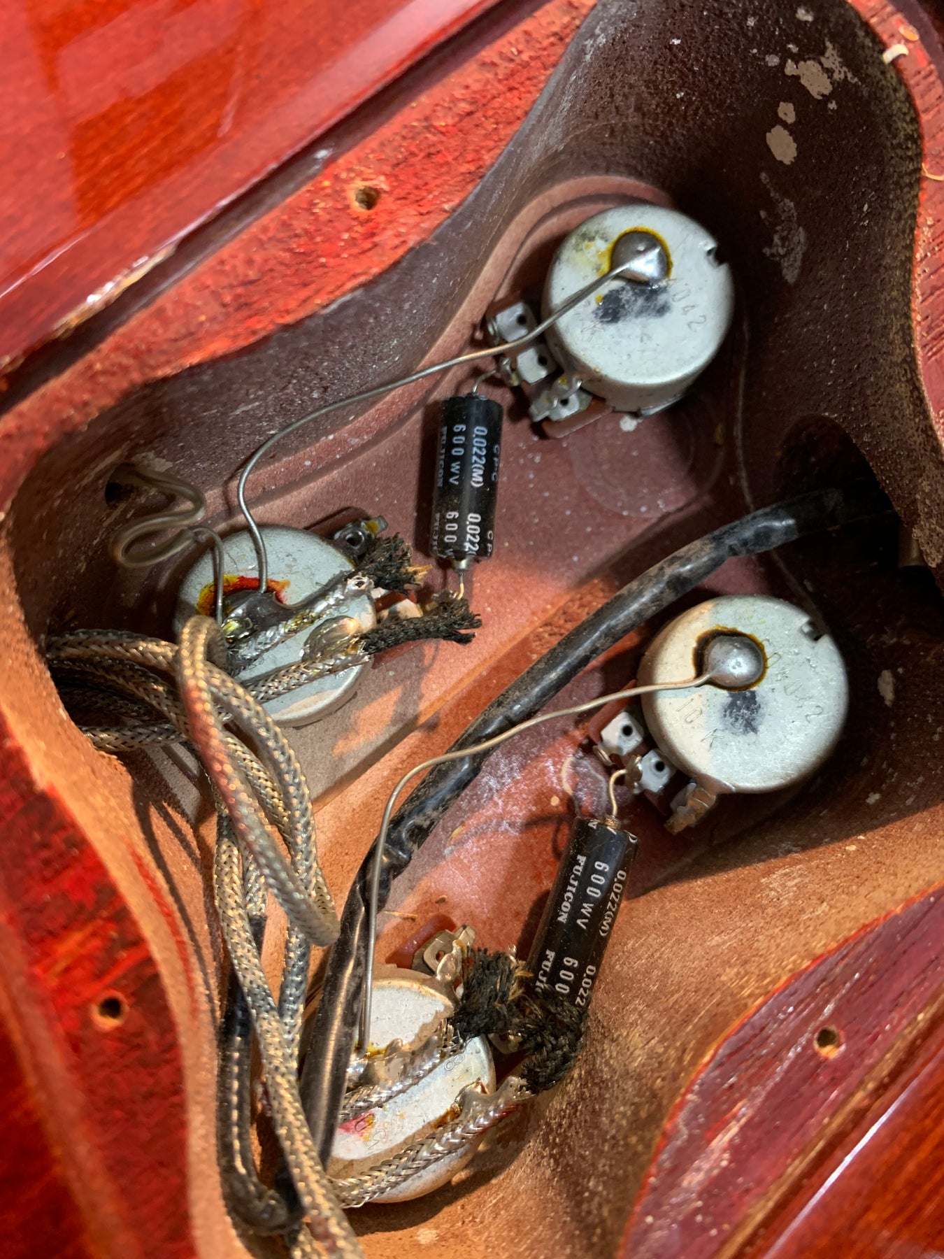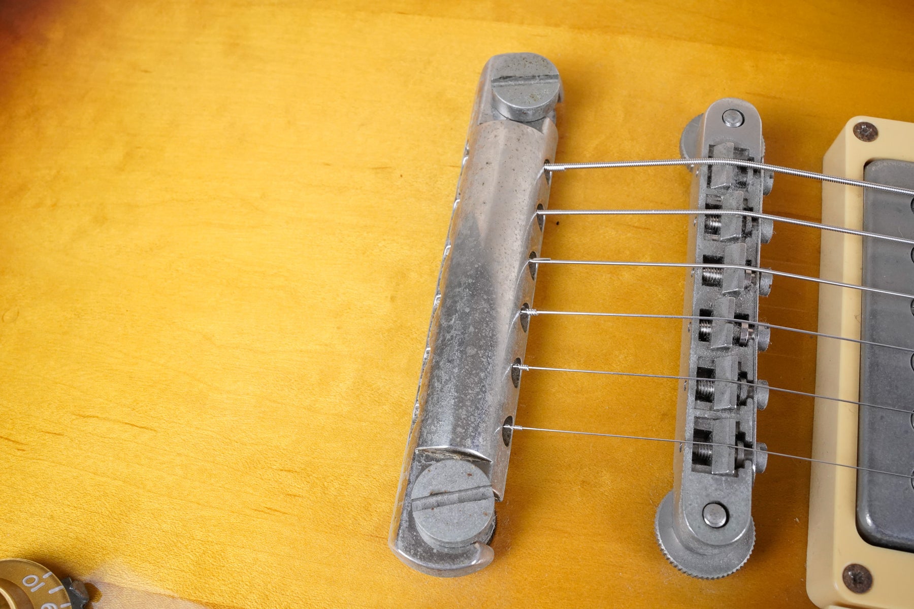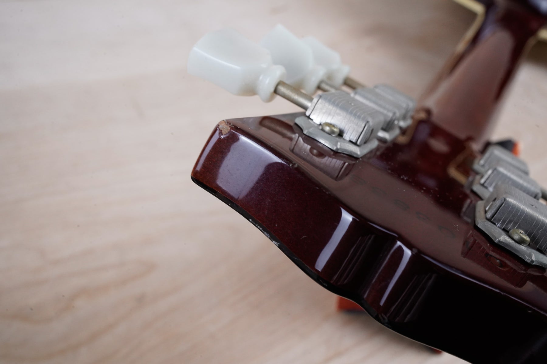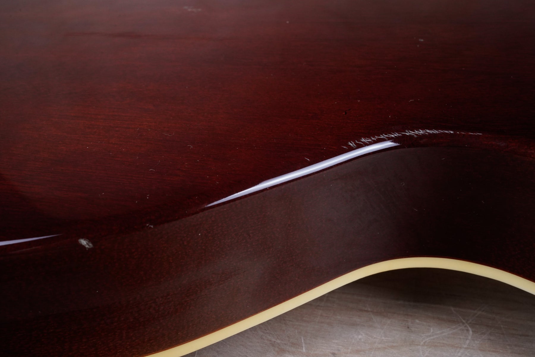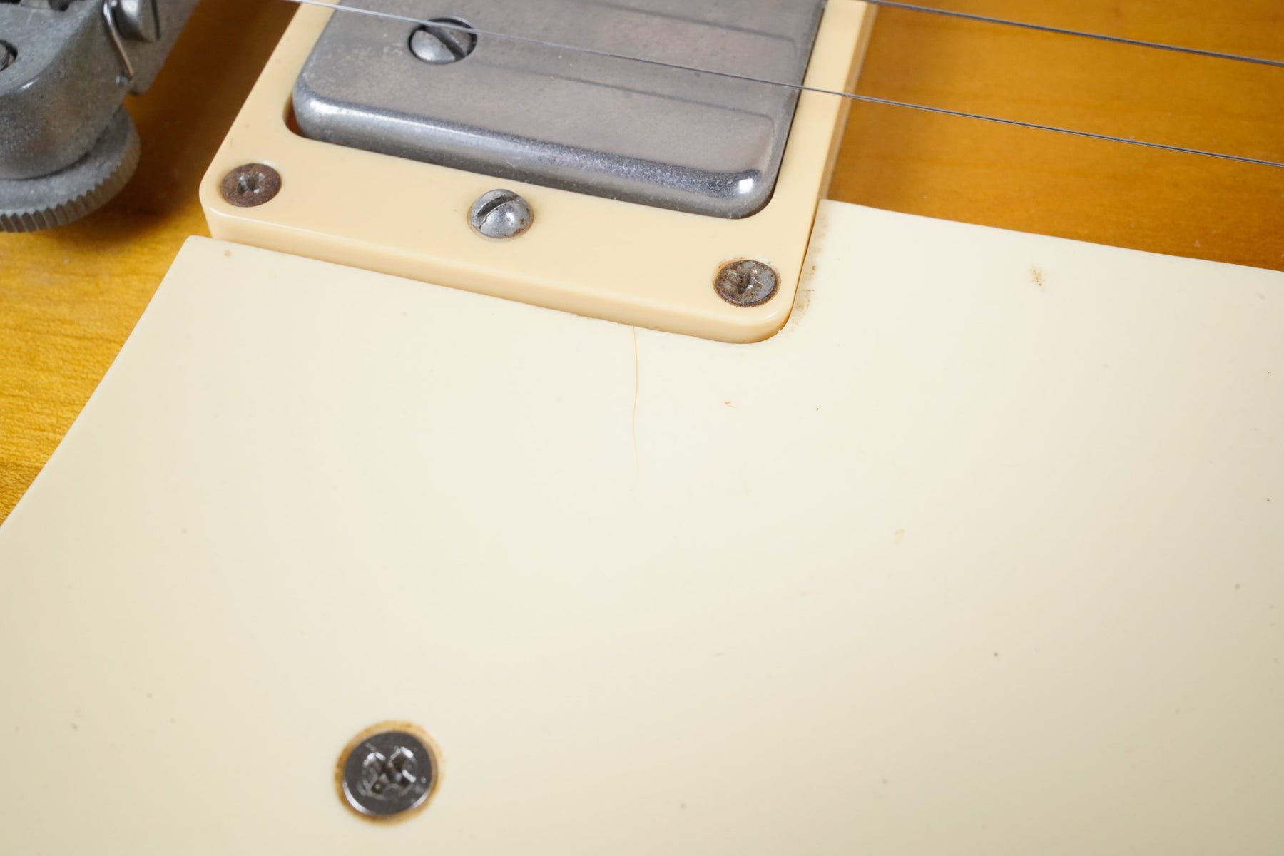 This guitar does show quite a bit of cosmetic wear from over the years that includes various surface scratches, scuffs, and dents throughout the body with additional wear along the back of the neck and headstock. There's a small chip located on the side of the upper bout and there's a small chip on the 12th fret inlay. The fretboard is scuffed in that particular area on the 12th fret. The lacquer finish on the headstock face shows some discoloration from over time. The pickup rings and binding around the neck and body have also yellowed and the hardware shows quite a bit of tarnish from over time. The frets are used but otherwise still play great and the electronics work as they should.