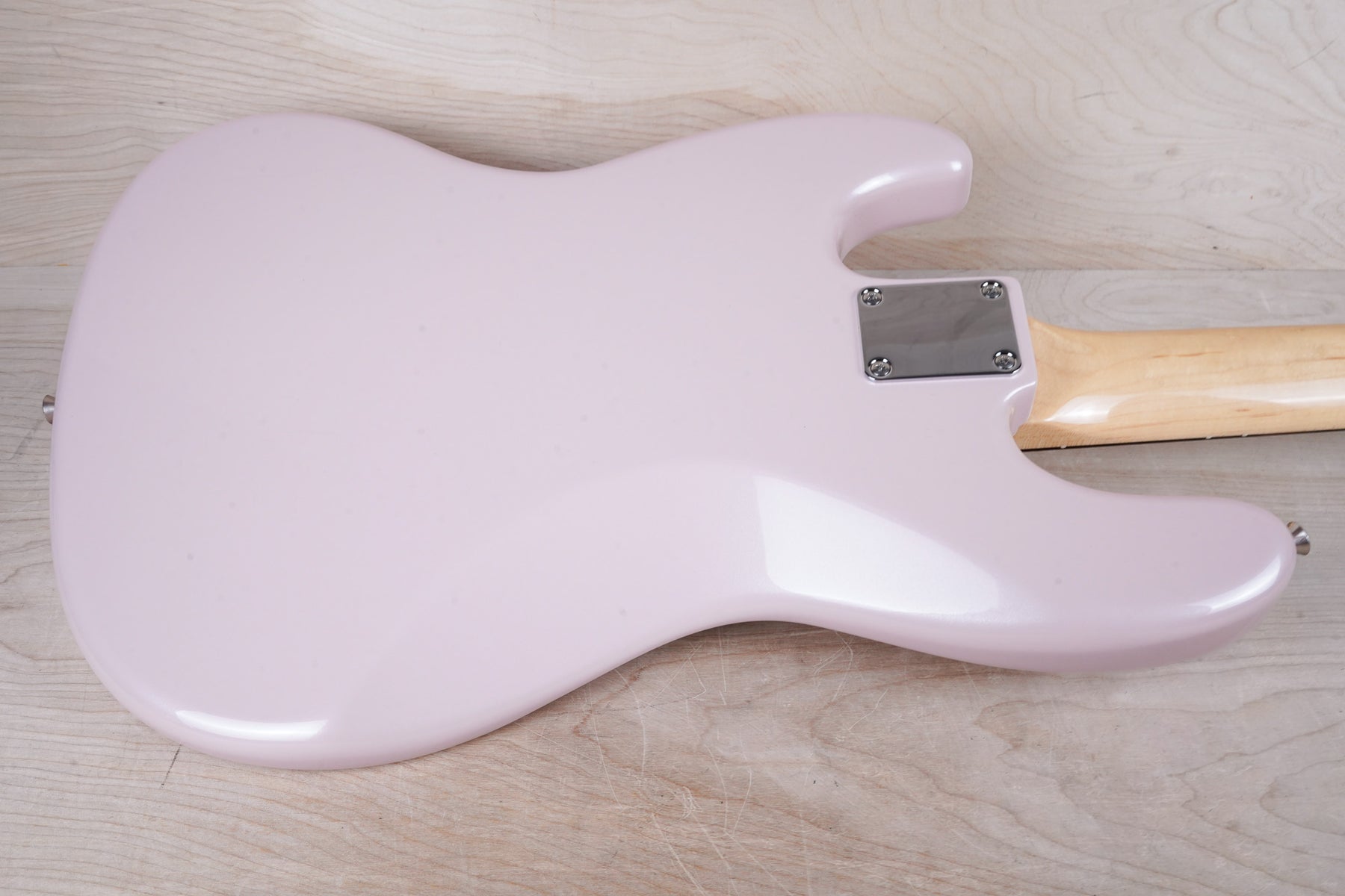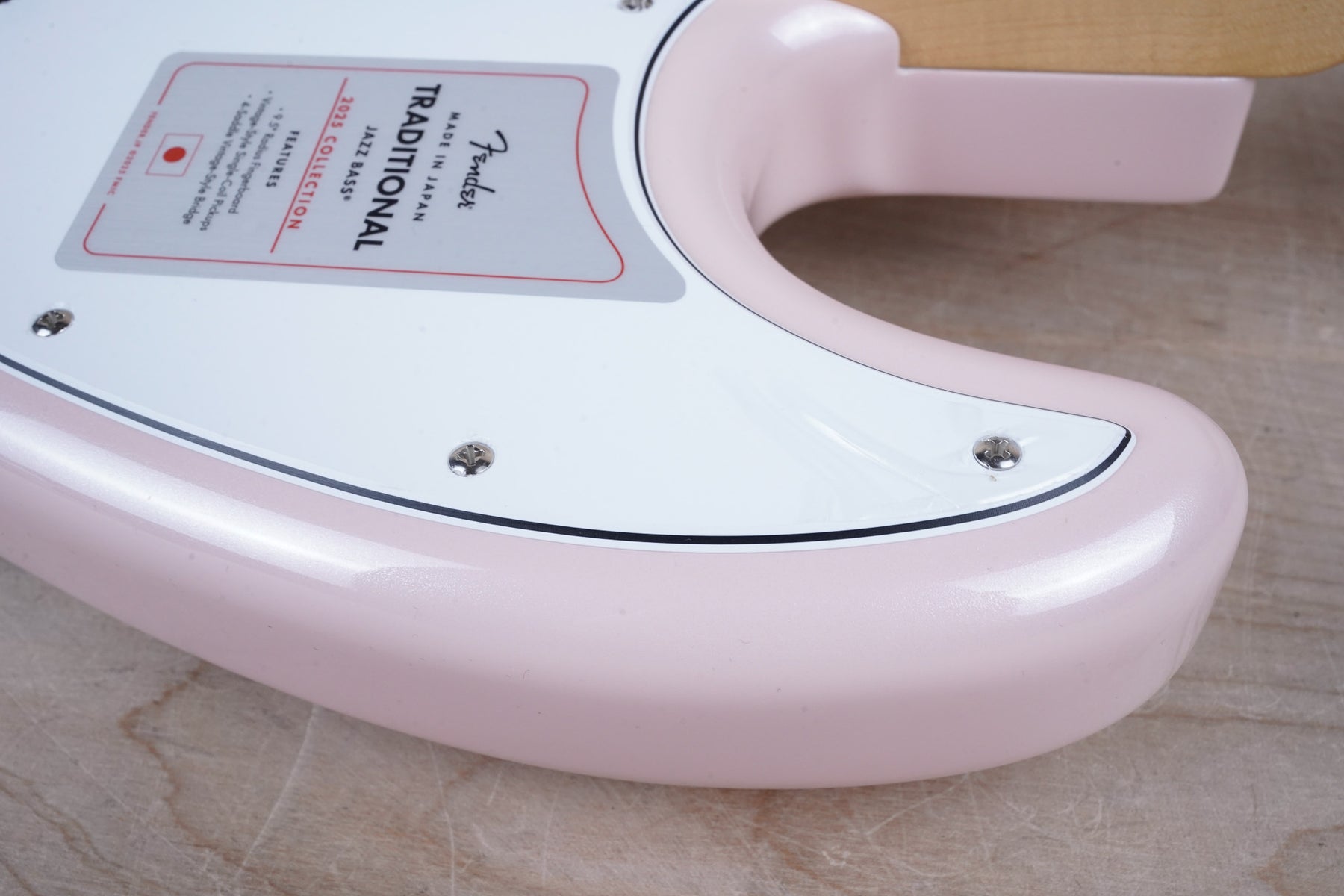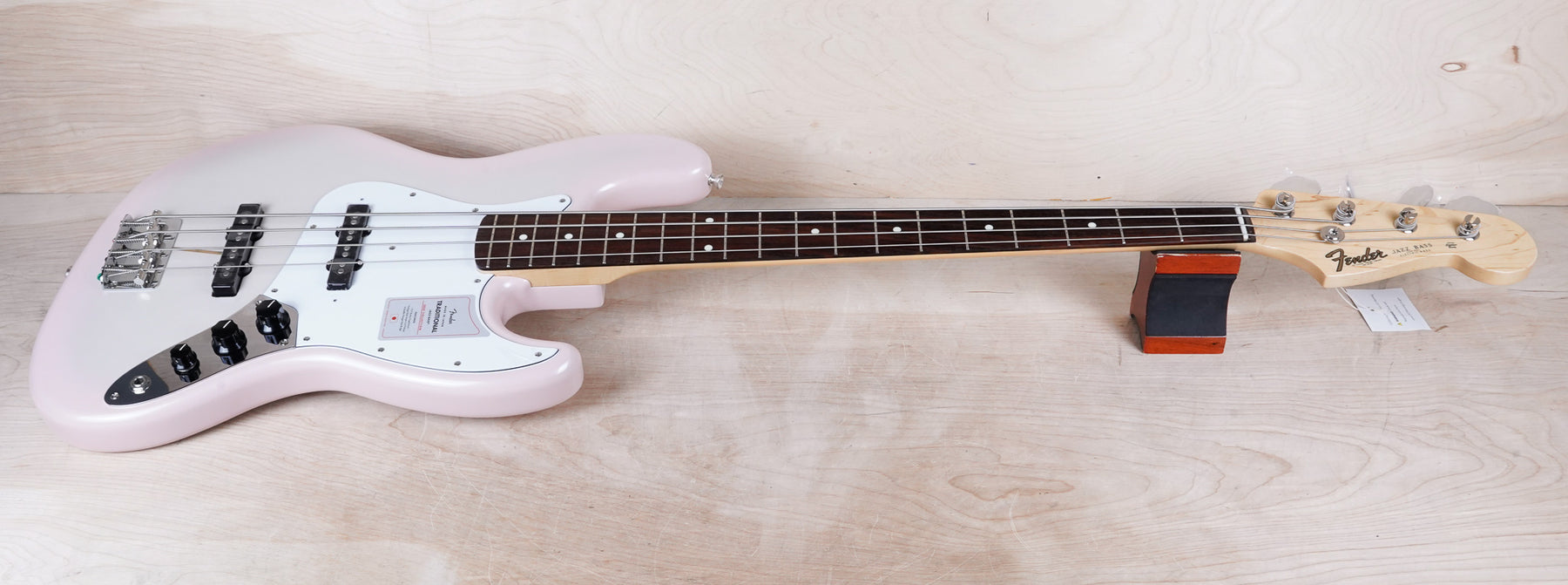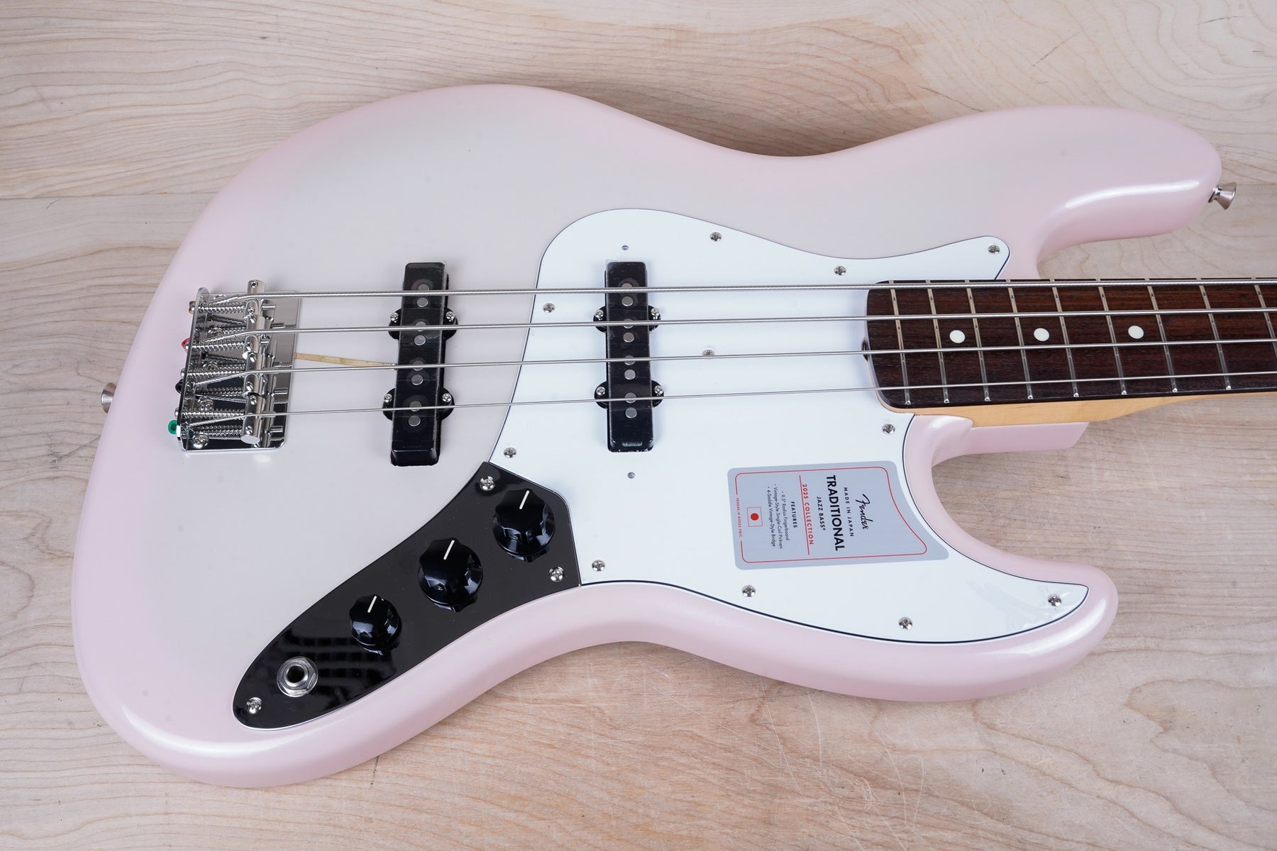 This made in Japan Fender Traditional II '60s Jazz Bass plays and sounds great! The bass is comprised of a basswood body, "U" shape maple neck, and rosewood fretboard. The stardust pink finish is such a cool and unique color!