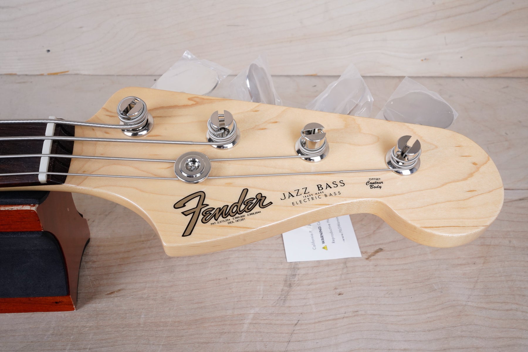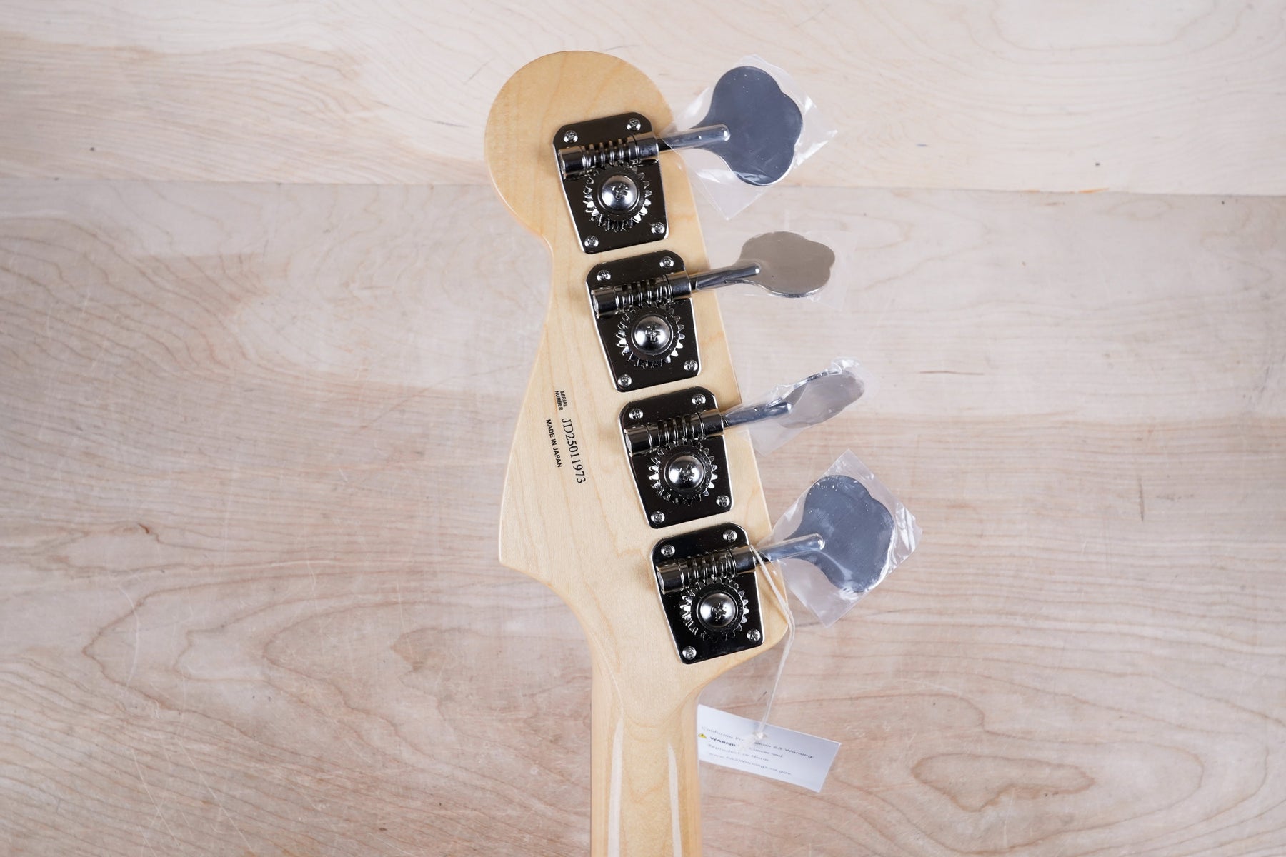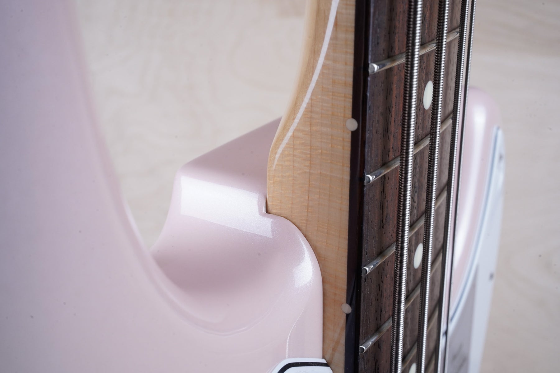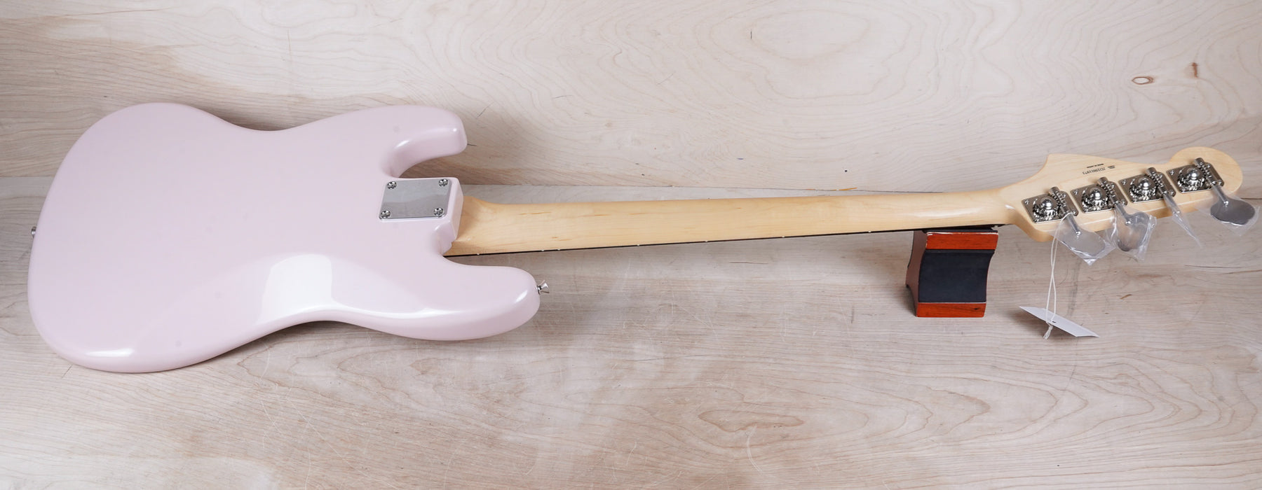 This made in Japan Fender Traditional II '60s Jazz Bass plays and sounds great! The bass is comprised of a basswood body, "U" shape maple neck, and rosewood fretboard. The stardust pink finish is such a cool and unique color!