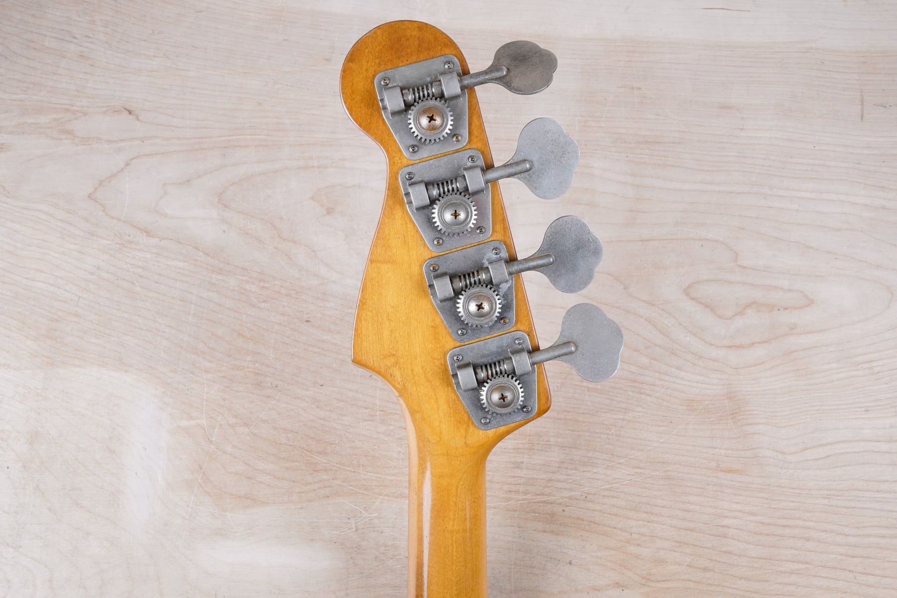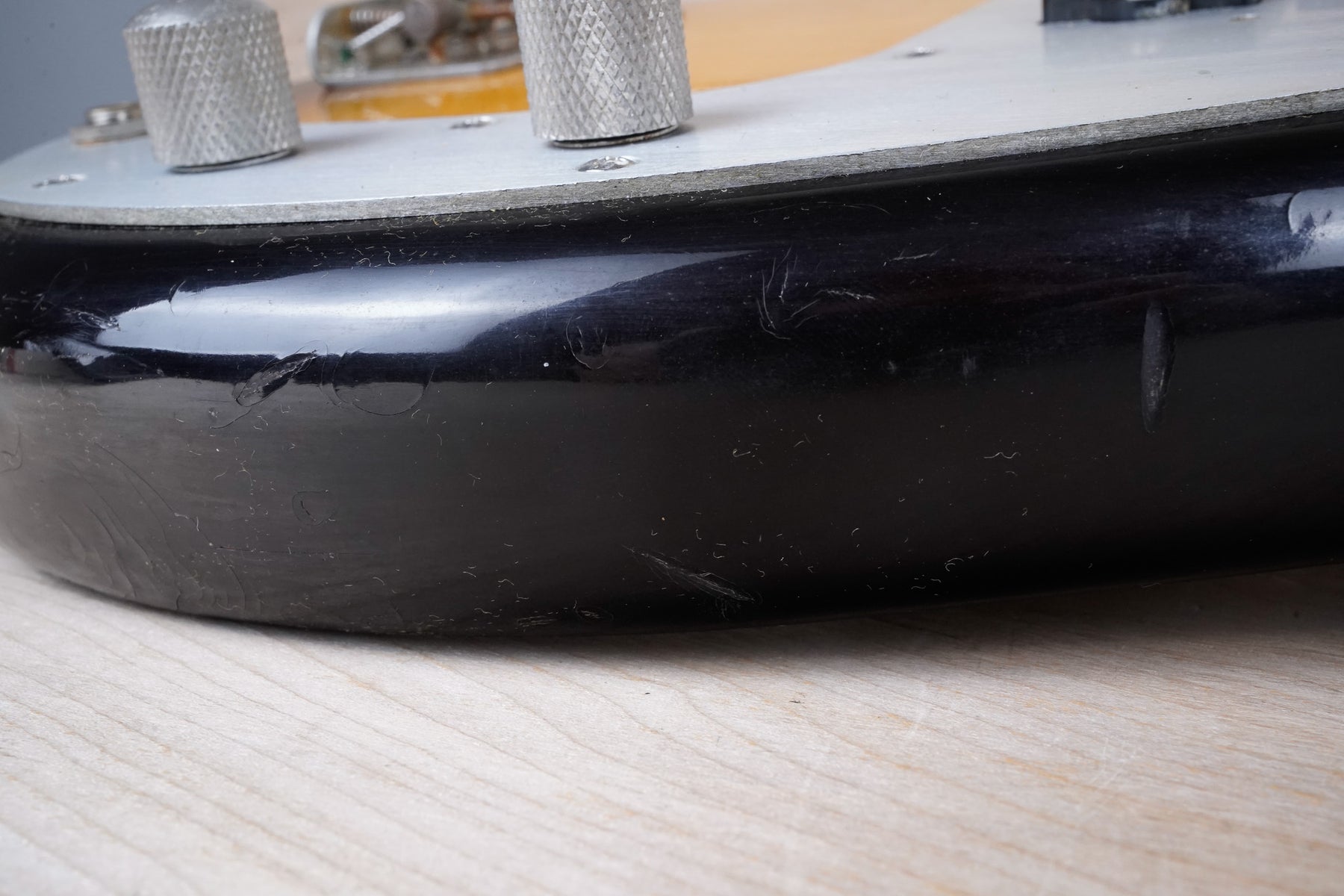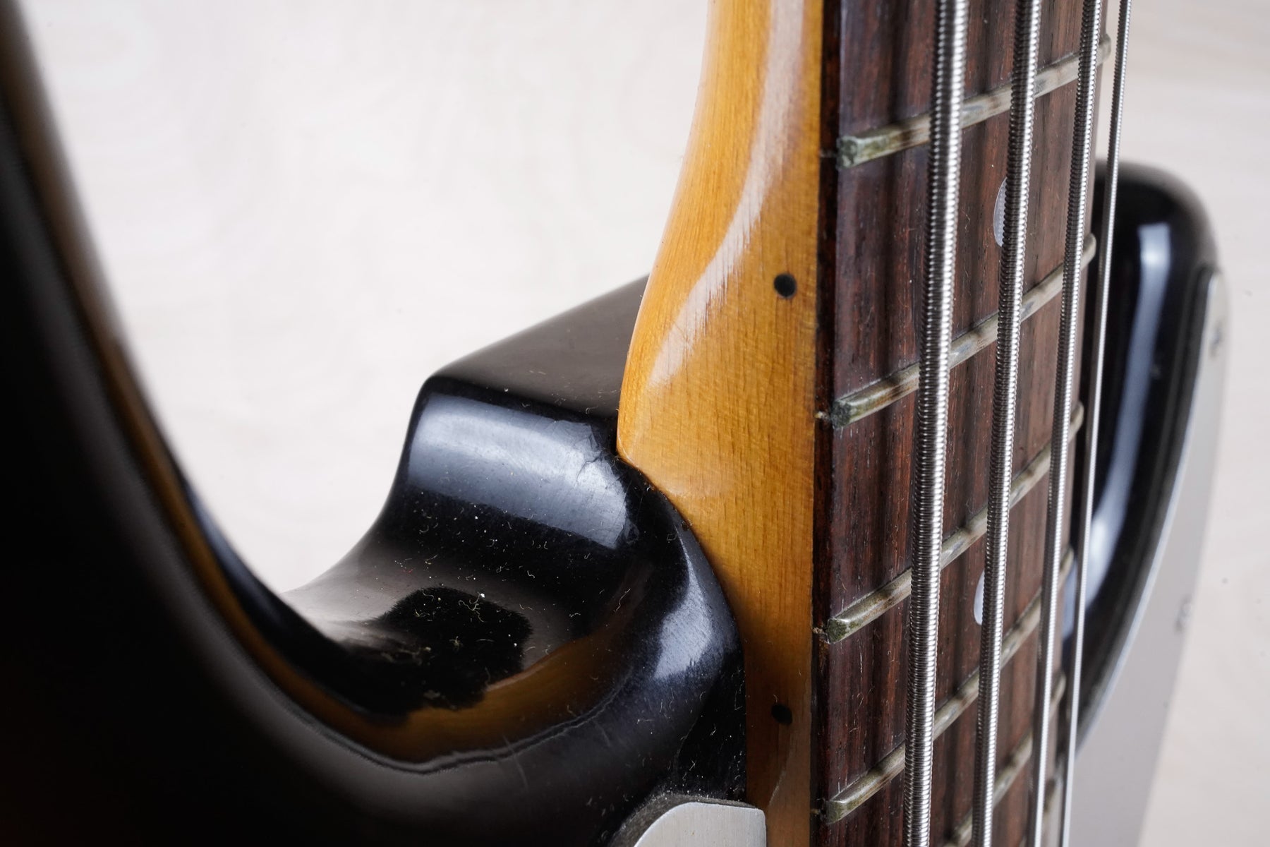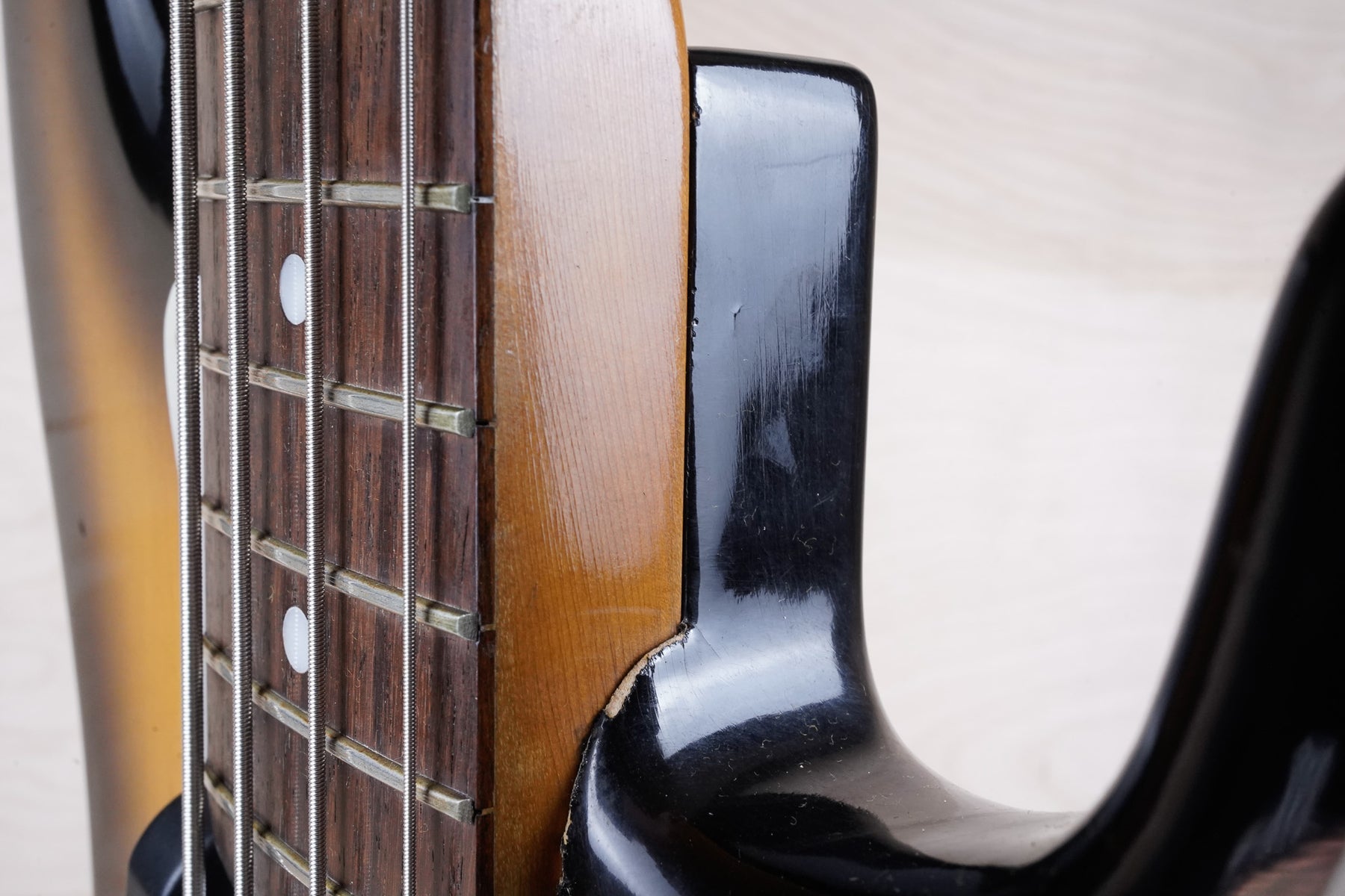 This bass does show quite a bit of cosmetic wear from over the years that includes various surface scratches, scuffs, dents, and finish chips throughout the body with additional dings along the back of the neck and headstock. The maple neck and headstock have aged from over time and parts of the Tokai Hard Puncher logo has peeled off. The hardware and pickguard also show normal tarnishing. The frets are lightly oxidized and appear to be lifting slightly on the upper frets. There's some minor fret buzz on the upper frets but overall the strings are playing well with medium action. All of the electronics work as they should.
