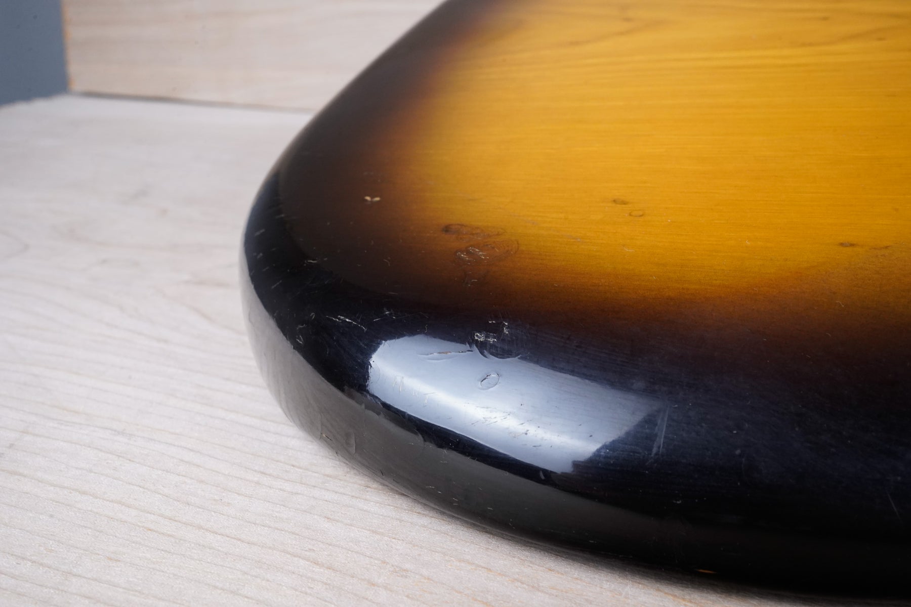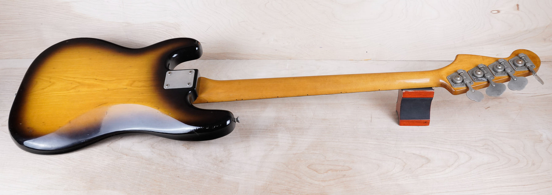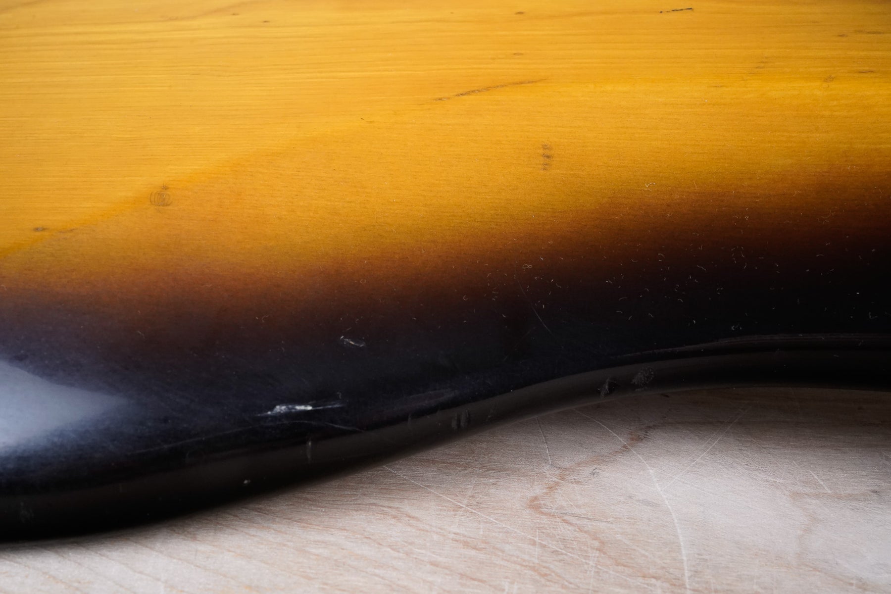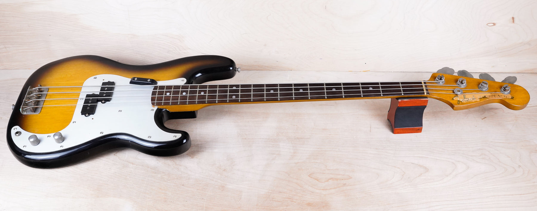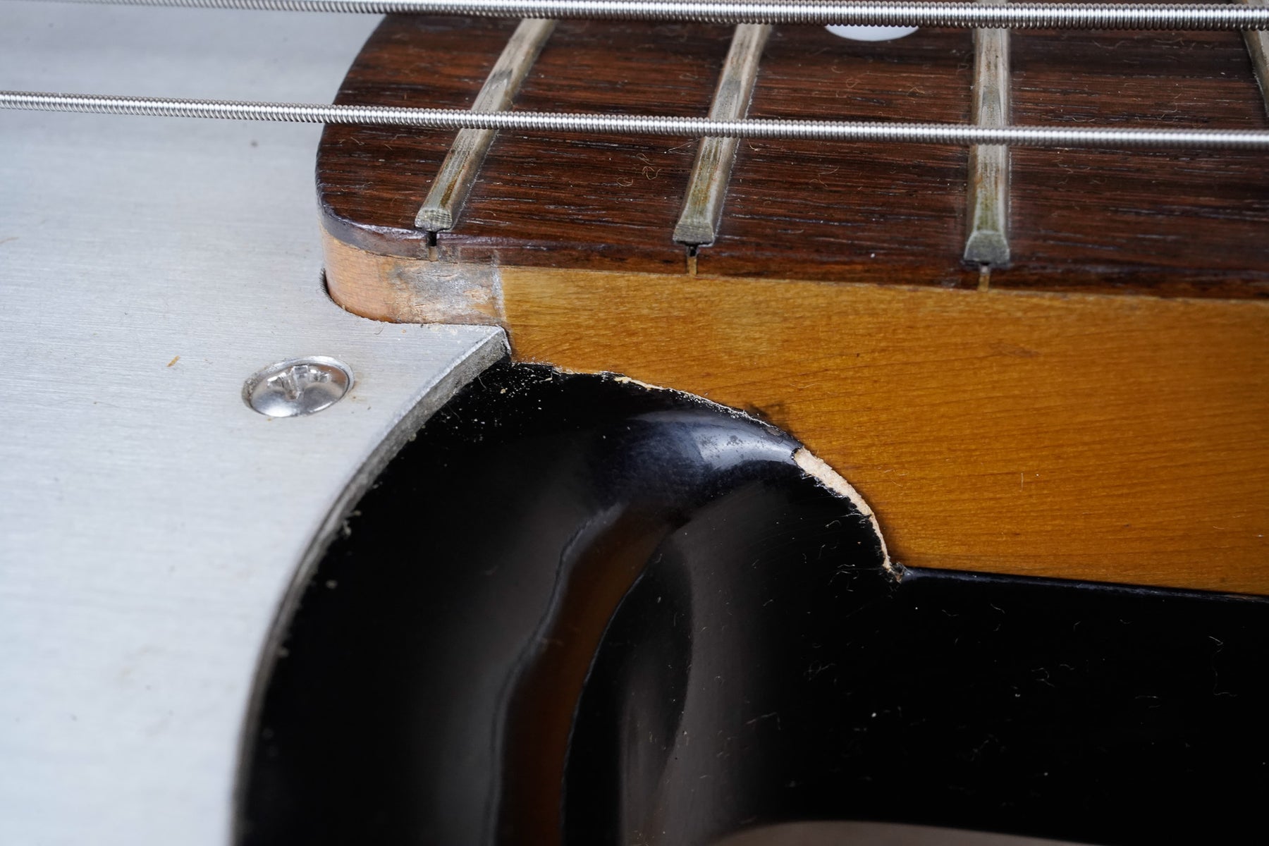 This bass does show quite a bit of cosmetic wear from over the years that includes various surface scratches, scuffs, dents, and finish chips throughout the body with additional dings along the back of the neck and headstock. The maple neck and headstock have aged from over time and parts of the Tokai Hard Puncher logo has peeled off. The hardware and pickguard also show normal tarnishing. The frets are lightly oxidized and appear to be lifting slightly on the upper frets. There's some minor fret buzz on the upper frets but overall the strings are playing well with medium action. All of the electronics work as they should.