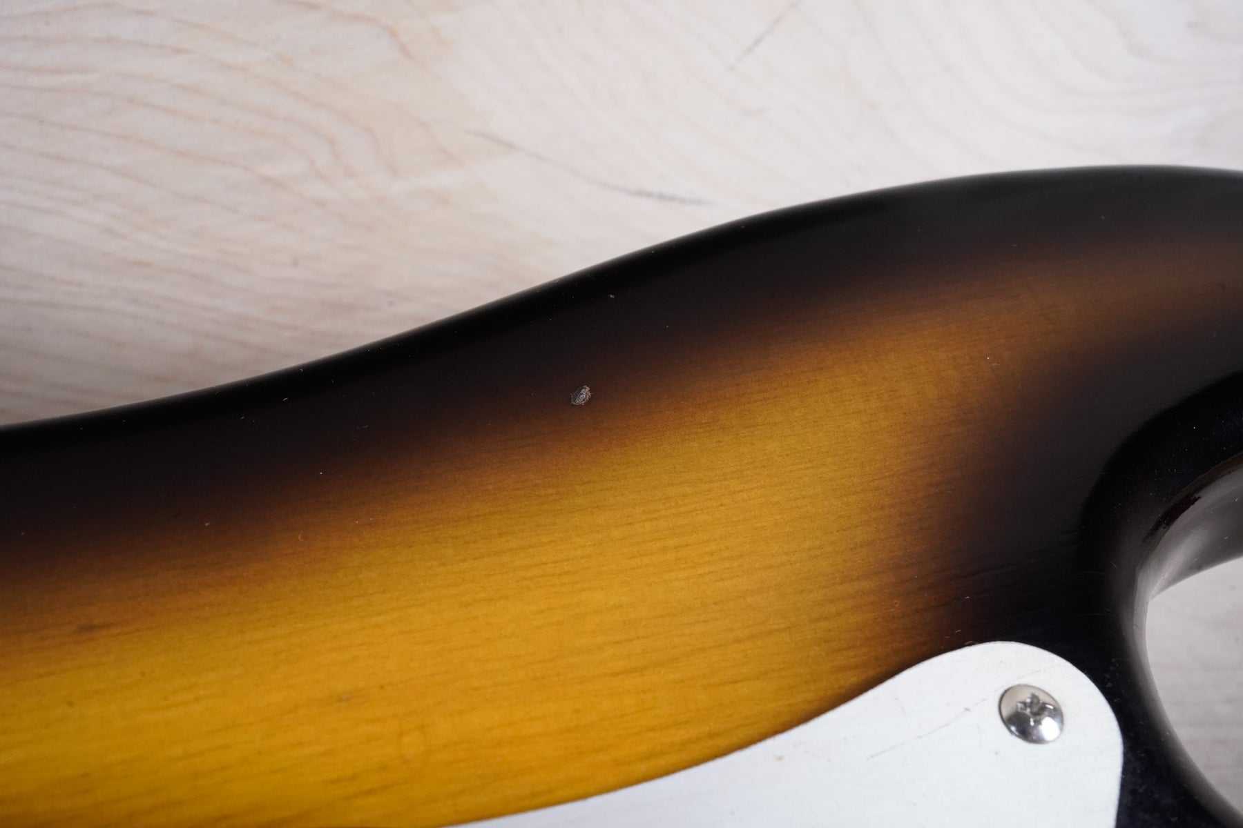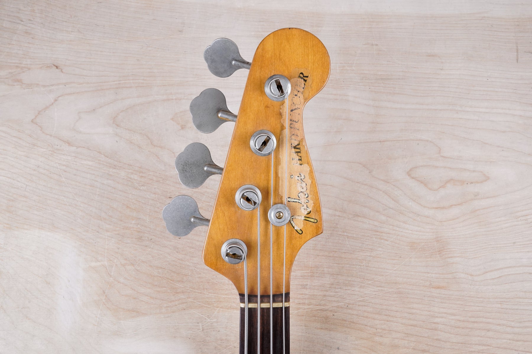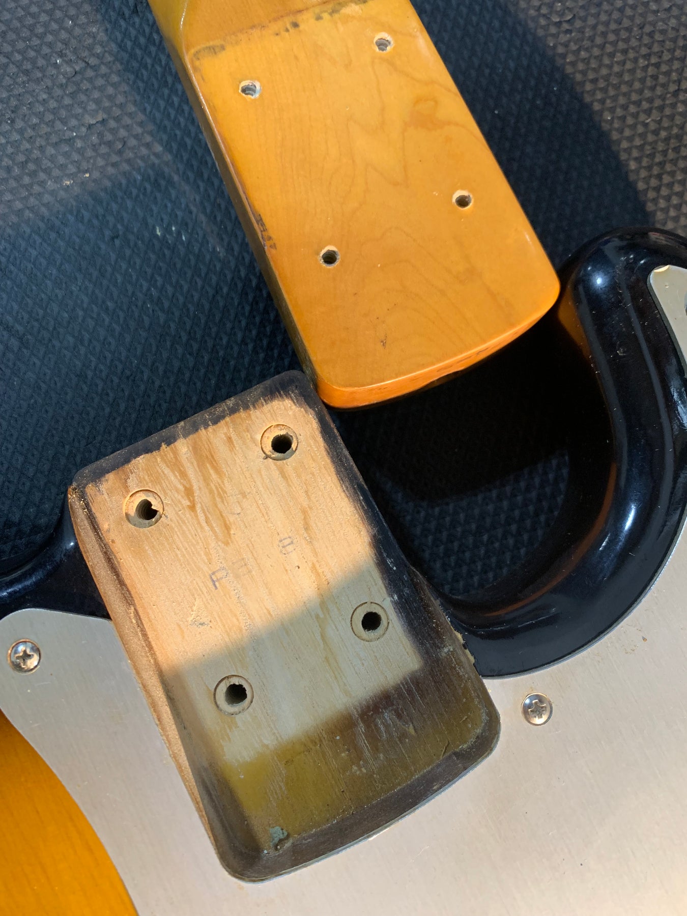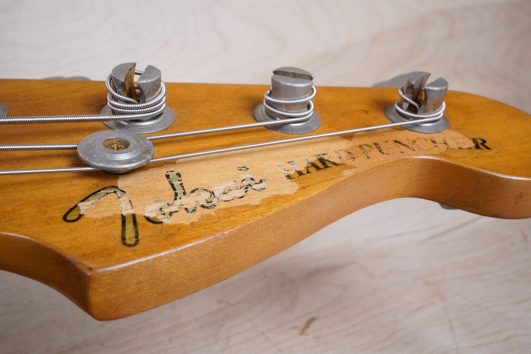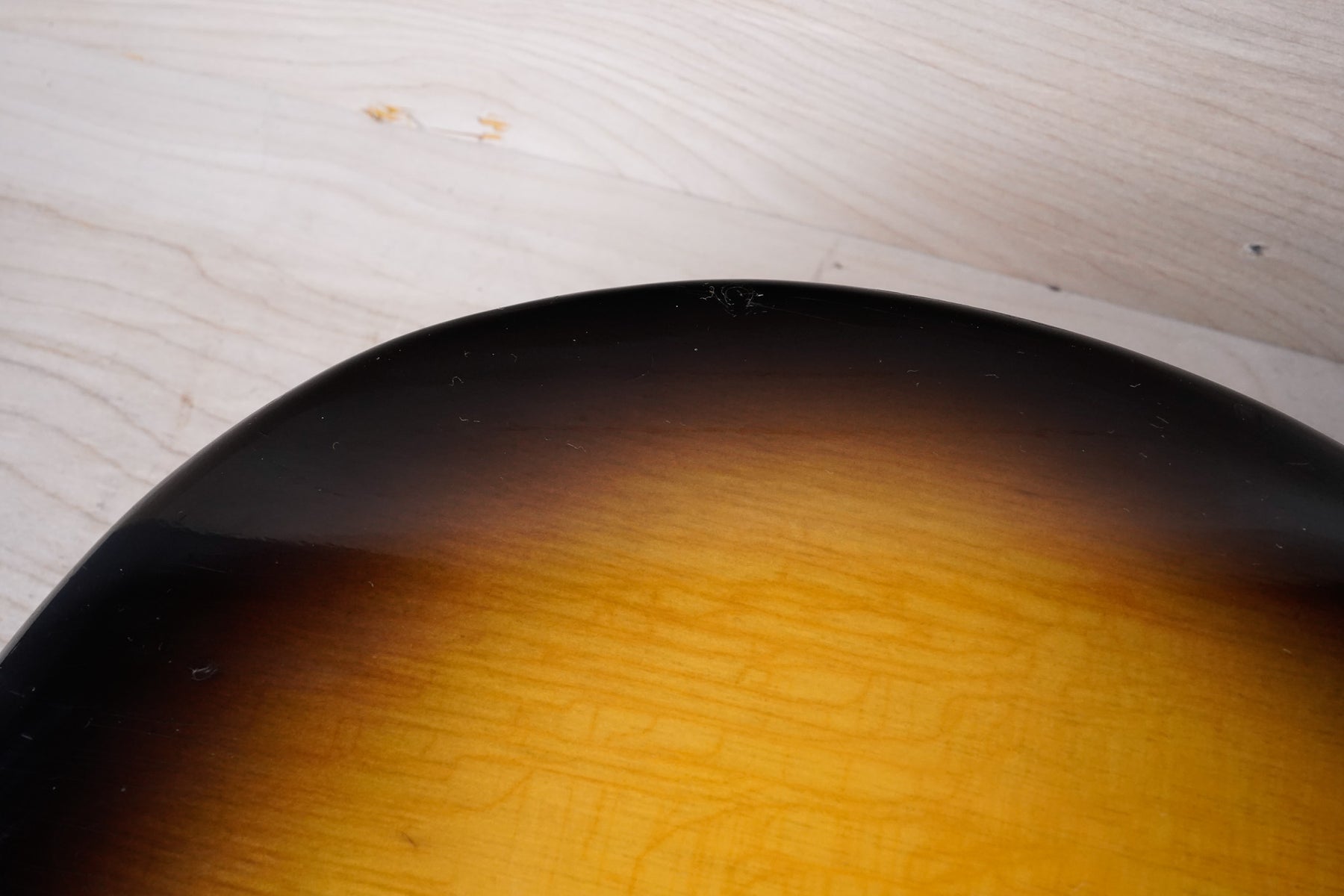 This bass does show quite a bit of cosmetic wear from over the years that includes various surface scratches, scuffs, dents, and finish chips throughout the body with additional dings along the back of the neck and headstock. The maple neck and headstock have aged from over time and parts of the Tokai Hard Puncher logo has peeled off. The hardware and pickguard also show normal tarnishing. The frets are lightly oxidized and appear to be lifting slightly on the upper frets. There's some minor fret buzz on the upper frets but overall the strings are playing well with medium action. All of the electronics work as they should.