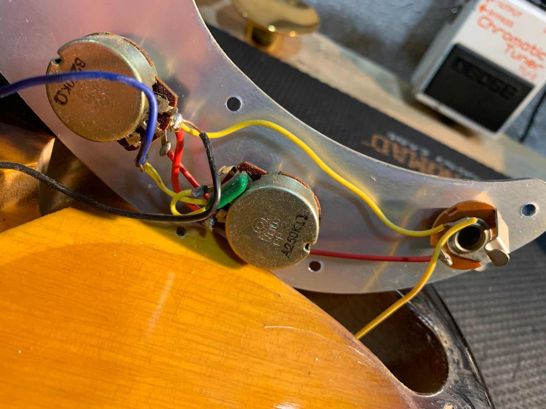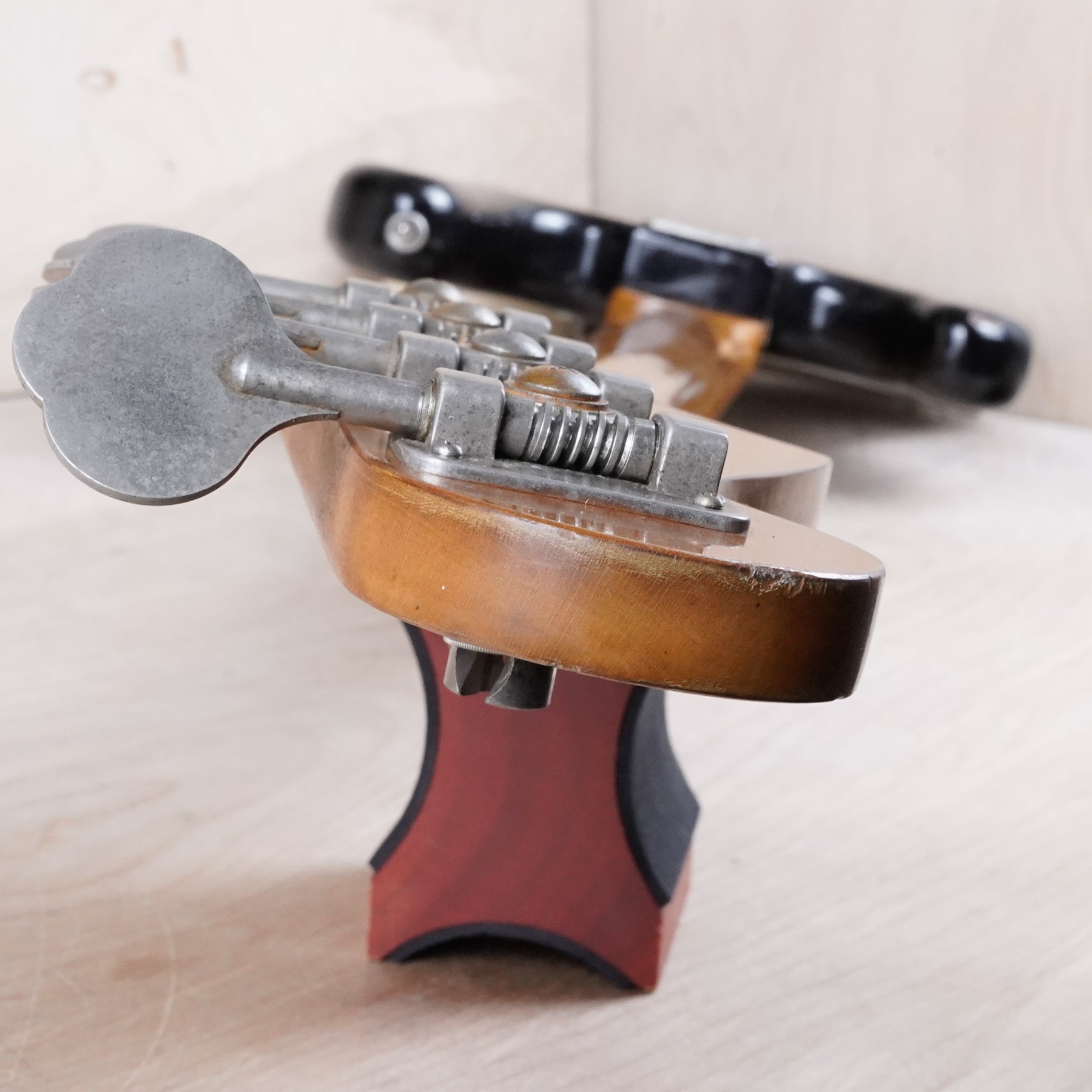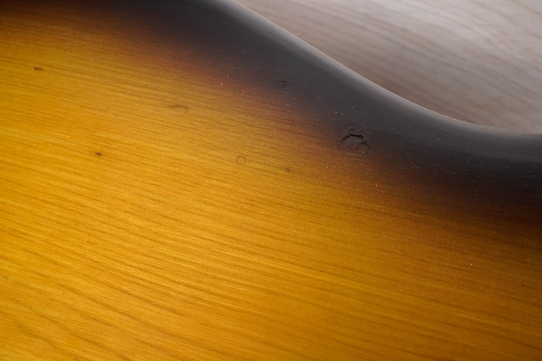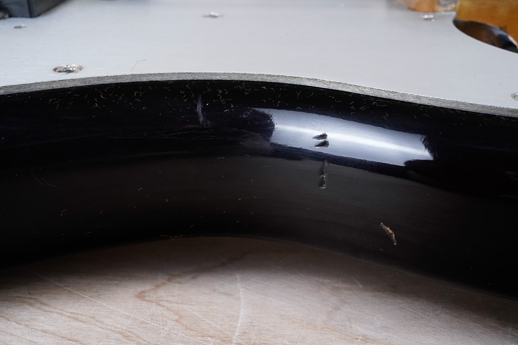 This bass does show quite a bit of cosmetic wear from over the years that includes various surface scratches, scuffs, dents, and finish chips throughout the body with additional dings along the back of the neck and headstock. The maple neck and headstock have aged from over time and parts of the Tokai Hard Puncher logo has peeled off. The hardware and pickguard also show normal tarnishing. The frets are lightly oxidized and appear to be lifting slightly on the upper frets. There's some minor fret buzz on the upper frets but overall the strings are playing well with medium action. All of the electronics work as they should.
